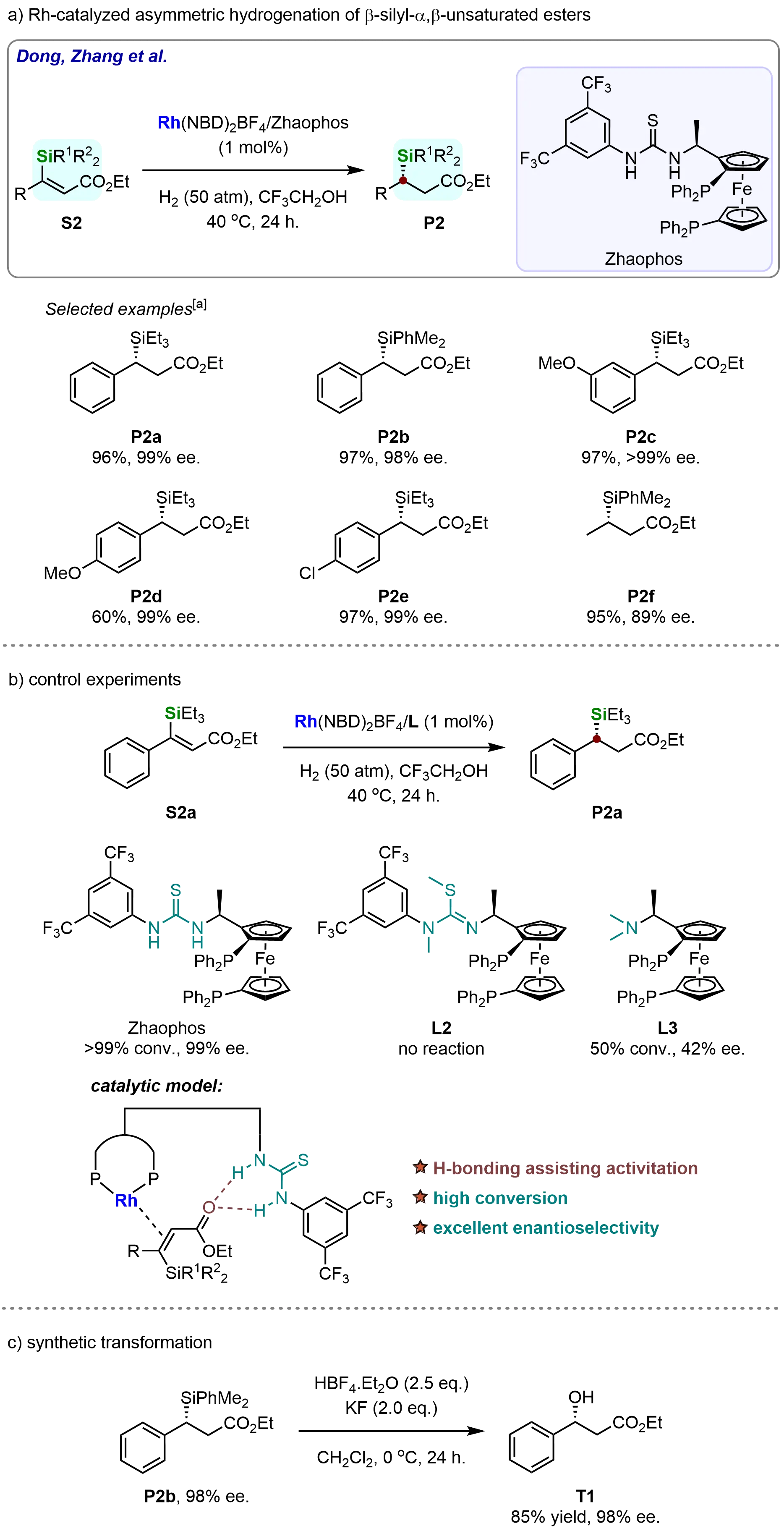 To further investigate the crucial role of the thiourea motif in the ZhaoPhos ligand, control experiments were conducted (Scheme 3b). Ligands L2 and L3, which lack the thiourea functionality, were tested under the optimized reaction conditions for the asymmetric hydrogenation of β-triethylsilyl-α,β-unsaturated ethyl ester (S2a). As shown in Scheme 2b, no conversion was observed with ligand L2, confirming the essential role of the thiourea group. In contrast, ligand L3 afforded modest conversion and enantioselectivity (50% conversion, 42% ee), further demonstrating the necessity of the thiourea motif for achieving high reactivity and enantioselectivity. These results indicate that the thiourea group contributes to substrate activation, likely through hydrogen bonding with the substrate, thereby enabling the observed high enantioselectivity.