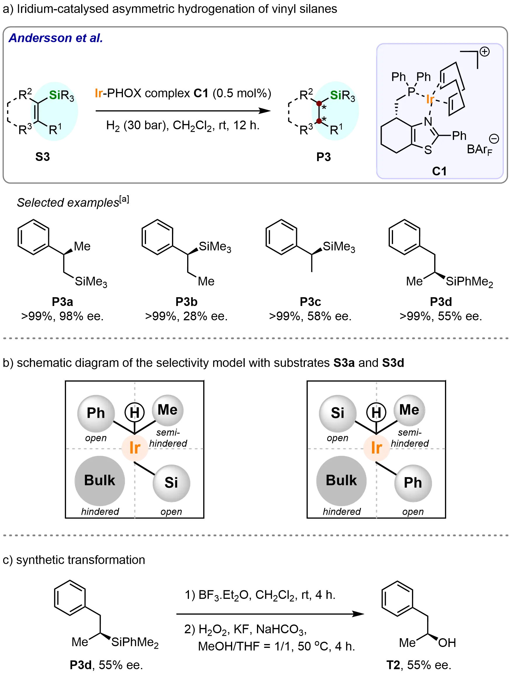 In 2006, Andersson and colleagues made a significant contribution to catalytic asymmetric hydrogenation by developing an iridium-catalyzed asymmetric hydrogenation of vinyl silanes, providing an efficient method for synthesizing various optically active silanes (Scheme 4a)[61]. The researchers demonstrated that an iridium thiazole complex (C1) was highly effective for this transformation, offering a versatile catalytic system compatible with a broad range of vinyl silane substrates. This system achieved excellent conversions for the corresponding optically active silanes, though enantioselectivities varied substantially, from poor to excellent. Notably, the β-stereogenic silane (P3a) was obtained with full conversion and a remarkable enantiomeric excess (ee) of 98%. In contrast, α-stereogenic silanes (P3b-P3d) were produced with lower enantioselectivities, ranging from 28% to 58% ee.