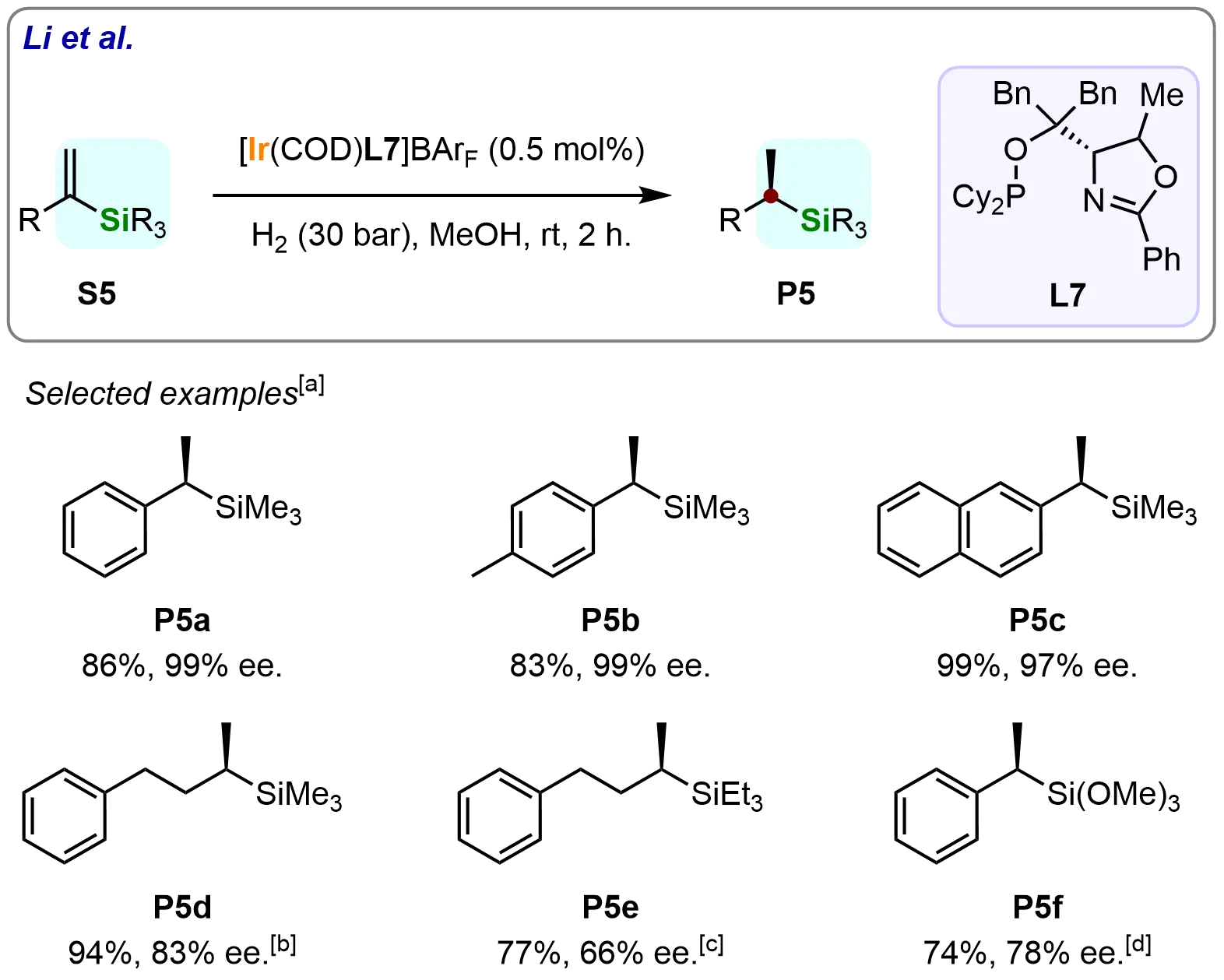 When the pyranoside phosphite-oxazoline ligand (L5) was employed in the iridium-catalyzed asymmetric hydrogenation of β-branched vinyl silane (S4), the desired β-stereogenic silane ((S)-P4) was obtained in full conversion with excellent enantioselectivity (97% ee) (Scheme 5b). This remarkable result demonstrates the high efficacy of L5 in enhancing both the rate and selectivity of the hydrogenation process, further advancing the utility of iridium-based catalysts in the synthesis of chiral organosilicon compounds.