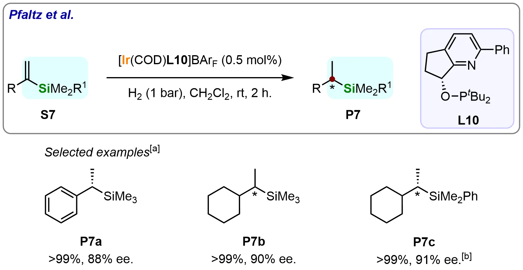 Building on these results, the team further investigated iridium-catalyzed asymmetric hydrogenation of terminal vinyl silanes using a pyridine-phosphinite ligand (L10) (Scheme 8)[66]. α-Trimethylsilylstyrene (S7a) converted to the α-stereogenic silane (P7a) with complete conversion and 88% ee. The system also accommodated cyclohexyl-substituted substrates (S7b and S7c), yielding chiral silanes with 90-91% ee. These results demonstrate the catalytic system’s versatility in hydrogenating diverse vinyl silanes across varying steric environments.