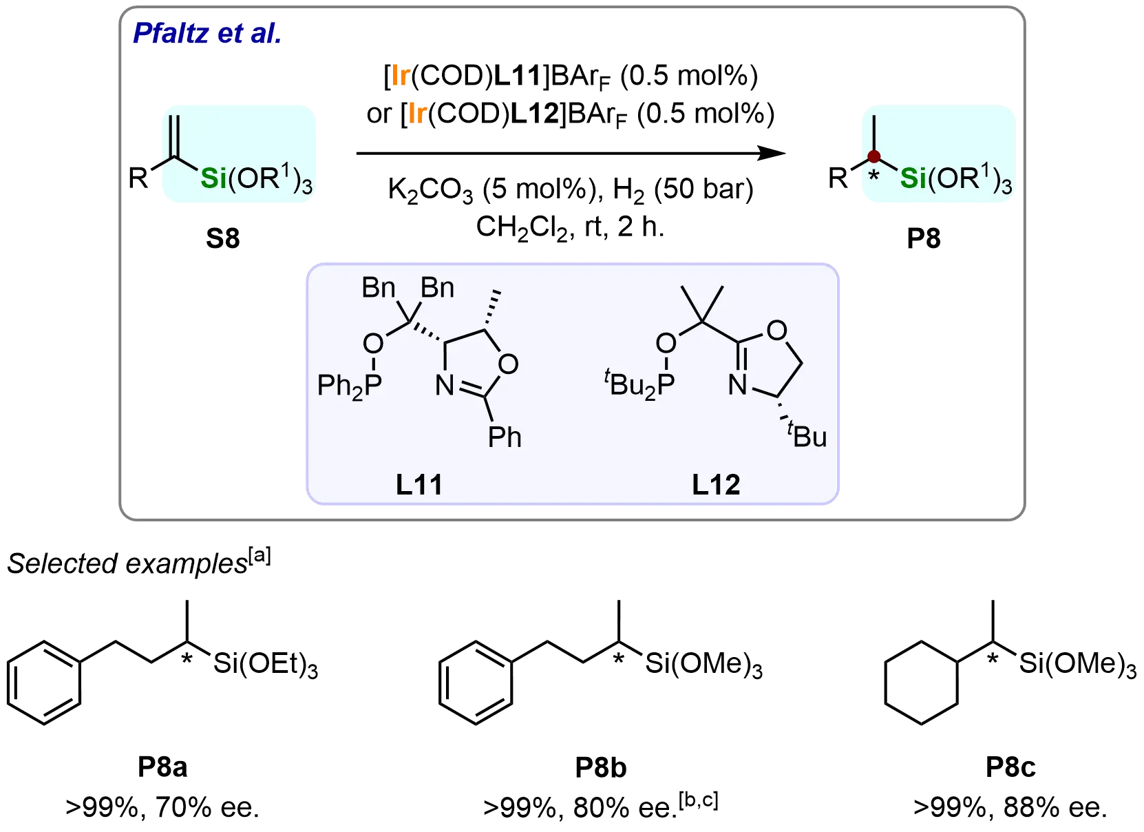 Furthermore, Pfaltz et al. extended the methodology to α-alkyl substituted trialkoxy(vinyl)silanes using PHOX ligand (L11) and its simplified derivative (L12) in iridium-catalyzed asymmetric hydrogenation (Scheme 9)[66]. The system efficiently converted various α-alkyl substrates (S8) to α-stereogenic silanes (P8) with complete conversion and 70-88% ee. This successful application to complex alkyl-substituted trialkoxy(vinyl)silanes further establishes the broad utility of the iridium catalytic system for diverse chiral silane synthesis.