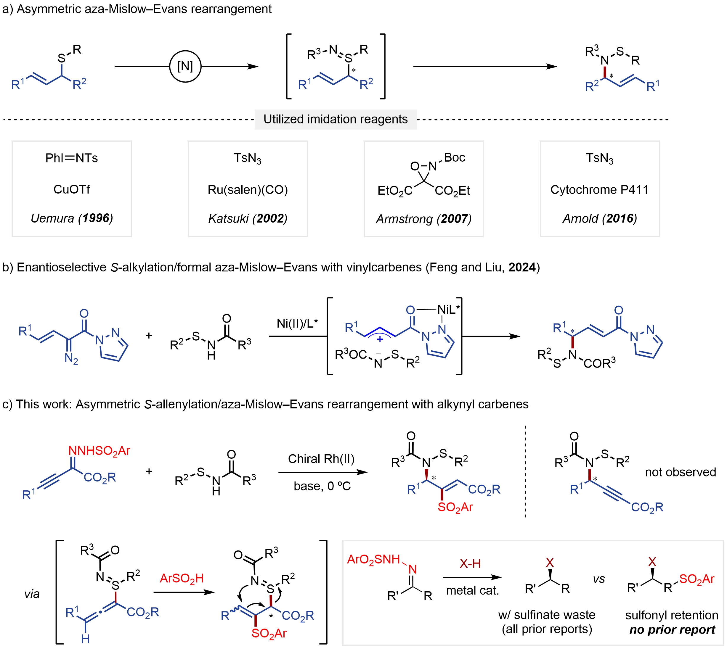 Sigmatropic rearrangements, involving the site-selective reorganization of molecular frameworks, represent a highly valuable class of transformations in synthetic chemistry due to their ability to create challenging chiral centers with high stereospecificity in complex structural motifs[1-7]. Given the rich reactivity of sulfinyl groups in chemical synthesis and pharmaceutical research[8-11], the sigmatropic rearrangement of allylic sulfur compounds has garnered significant interest over the years[12]. Among these, the Mislow-Evans rearrangement is a reversible [2,3]-sigmatropic shift converting allylic sulfoxides into allylic sulfenate esters, with equilibrium generally favoring sulfoxides. In the presence of thiophiles, however, S–O bond cleavage of the sulfenate esters enables the stereoselective formation of allylic alcohols[13-17]. This classical transformation has proven synthetically powerful in the stereoselective preparation of various bioactive molecules, drugs, and natural products[18-21]. Nevertheless, the related [2,3]-sigmatropic rearrangement of allylic sulfilimines, the nitrogen analogues of allylic sulfoxides, has received comparatively limited attention, despite its potential to produce synthetically and medicinally valuable allylic sulfenamides (Figure 1A)[22-24]. Challenger reported the first aza-Mislow-Evans rearrangement of allylic sulfilimines to allylic sulfenates in 1952[22], although its application remains limited due to the lack of effective methods for preparing enantioenriched allylic sulfilimine intermediates. To date, three strategies have been developed for their preparation. The first strategy involves the α-sulfenylation of aldehydes, followed by oxidative S-imidation using N-Boc-oxaziridine[25-29]. The second relies on asymmetric sulfimidation of achiral allylic sulfides using a bisoxazoline complex, a ruthenium-salen complex, or an enzyme as catalyst to generate metal nitrene species from [N-(p-toluenesulfonyl)imino]phenyliodinane (TsN=IPh) and tosyl azides[30-34]. However, these two strategies are of limited synthetic utility due to the involvement of dangerous imidation agents, multistep procedures, and narrow substrate scope. Recently, Feng and Liu described an elegant nickel-catalyzed asymmetric synthesis of allylic sulfenamides via a formal aza-Mislow-Evans rearrangement of allylic sulfilimines through loose ion pair intermediates, arising from in situ S-alkylation of sulfenamides[35-54] and hazardous vinyl α-diazo pyrazoleamides (Figure 1B)[55]. Despite these advancements, there remains a pressing need for mild and more efficient strategies to generate allylic sulfilimine intermediates without using hazardous reagents, so as to fully leverage the potential of enantioselective aza-Mislow-Evans rearrangement.
