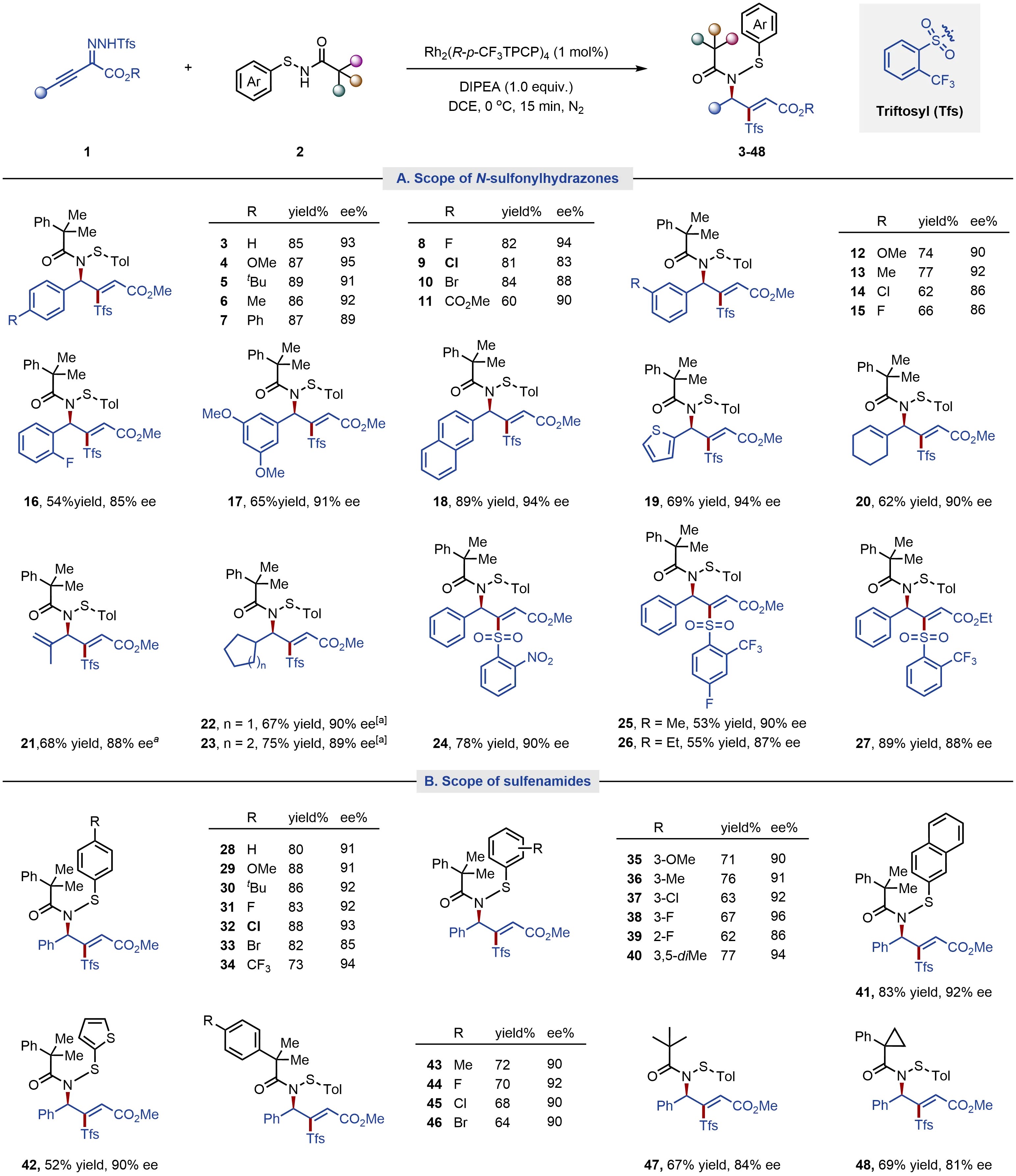 Figure 2. Substrate scope of alkynyl N-sulfonylhydrazones and sulfenamides. Reaction Conditions: alkynyl N-sulfonylhydrazones (0.15 mmol), sulfenamides (1.25 equiv.), DIPEA (1.0 equiv.), and Rh2(R-p-CF3TPCP)4 (1 mol%) in DCE (1.5 mL) at 0 °C for 15 min under N2 atmosphere. Isolated yield. [a]: Rh2(R-p-PhTPCP)4 was used as the catalyst; DIPEA: N, N-diisopropylethylamine; DCE: 1,2-dichloroethane.