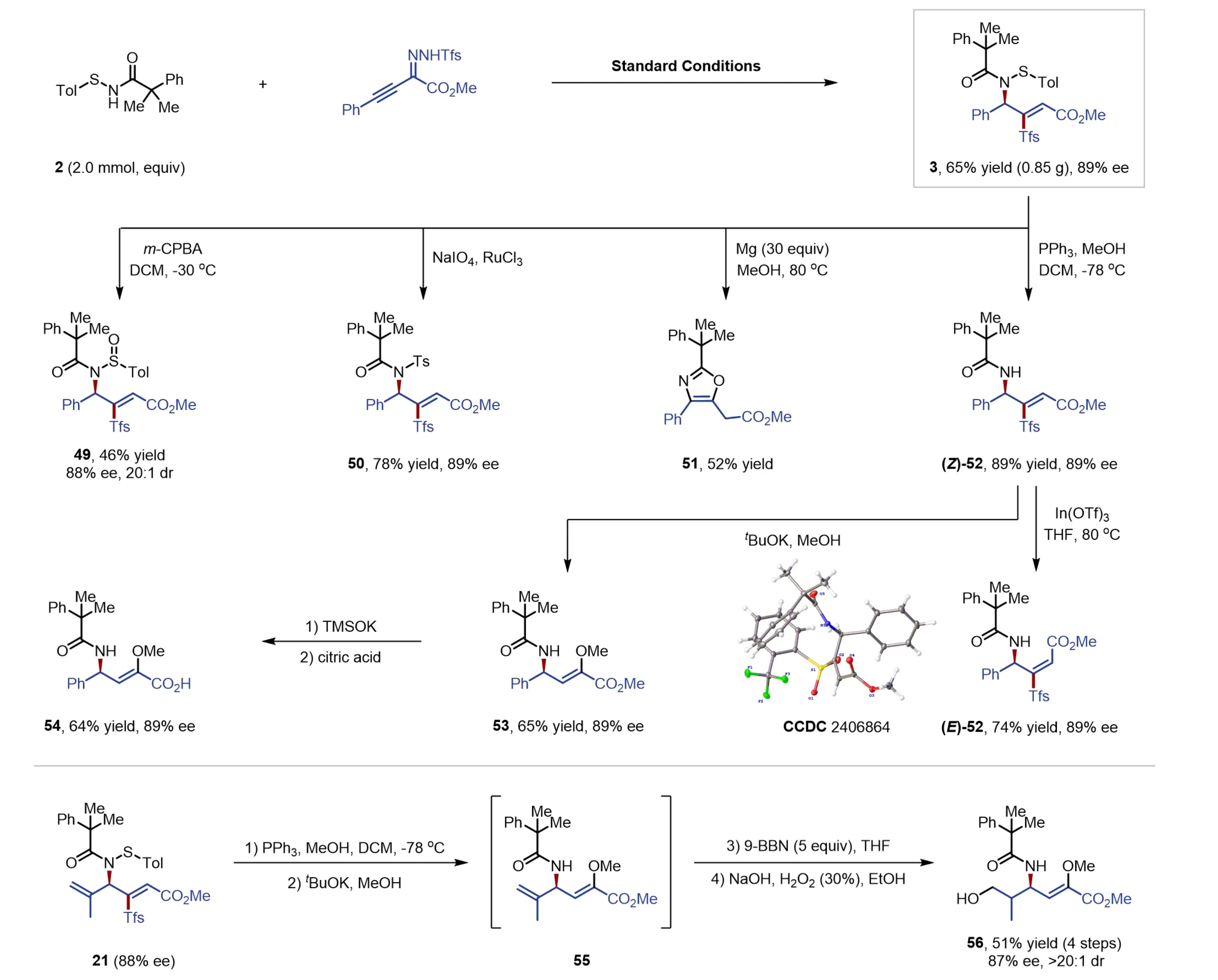 To demonstrate the synthetic utility of the developed methodology, a gram-scale synthesis of product 3 was performed (Figure 3). The comparable outcome (0.85 g, 65% yield, 89% ee) was achieved, highlighting the potential for practical large-scale application. Subsequent transformations were conducted to illustrate the versatility of the newly synthesized allylic sulfenamides (Figure 3, top). Oxidation of 3 with m-CPBA produced the allylic sulfinamide 49 with high diastereoselectivity (20:1 dr), whereas the NaIO4/RuCl3 catalytic system enabled the full oxidation to deliver the desired sulfonamide 50 in good yield without compromising stereoselectivity. Treatment of 3 with magnesium in methanol triggered a desulfonylative cyclization, leading to the formation of oxazoline 51 in 52% yield. Desulfurization of 3 by PPh3 gave allylic amide (Z)-52 in 89% yield with 89% ee, which then readily isomerized into more stable (E)-52 in the presence of In(OTf)3 without losing chirality. The structure of the latter isomer was confirmed by single-crystal X-ray crystallographic analysis (CCDC 2406864). Furthermore, the direct treatment of (Z)-52 with tBuOK in methanol produced methoxy-substituted allylic amide (53) with preserved enantioselectivity via an addition-elimination pathway. Hydrolysis of the ester group of 53 delivered the corresponding chiral carboxylic acid (54) with high enantioselectivity. Additionally, compound 21 was efficiently converted into the primary alcohol 56 through a sequence involving desulfurization, nucleophilic addition and olefin hydration, achieving high enantio- and diastereoselectivity control (Figure 3, bottom). In all cases, the enantiopurity of the chiral products was essentially observed.