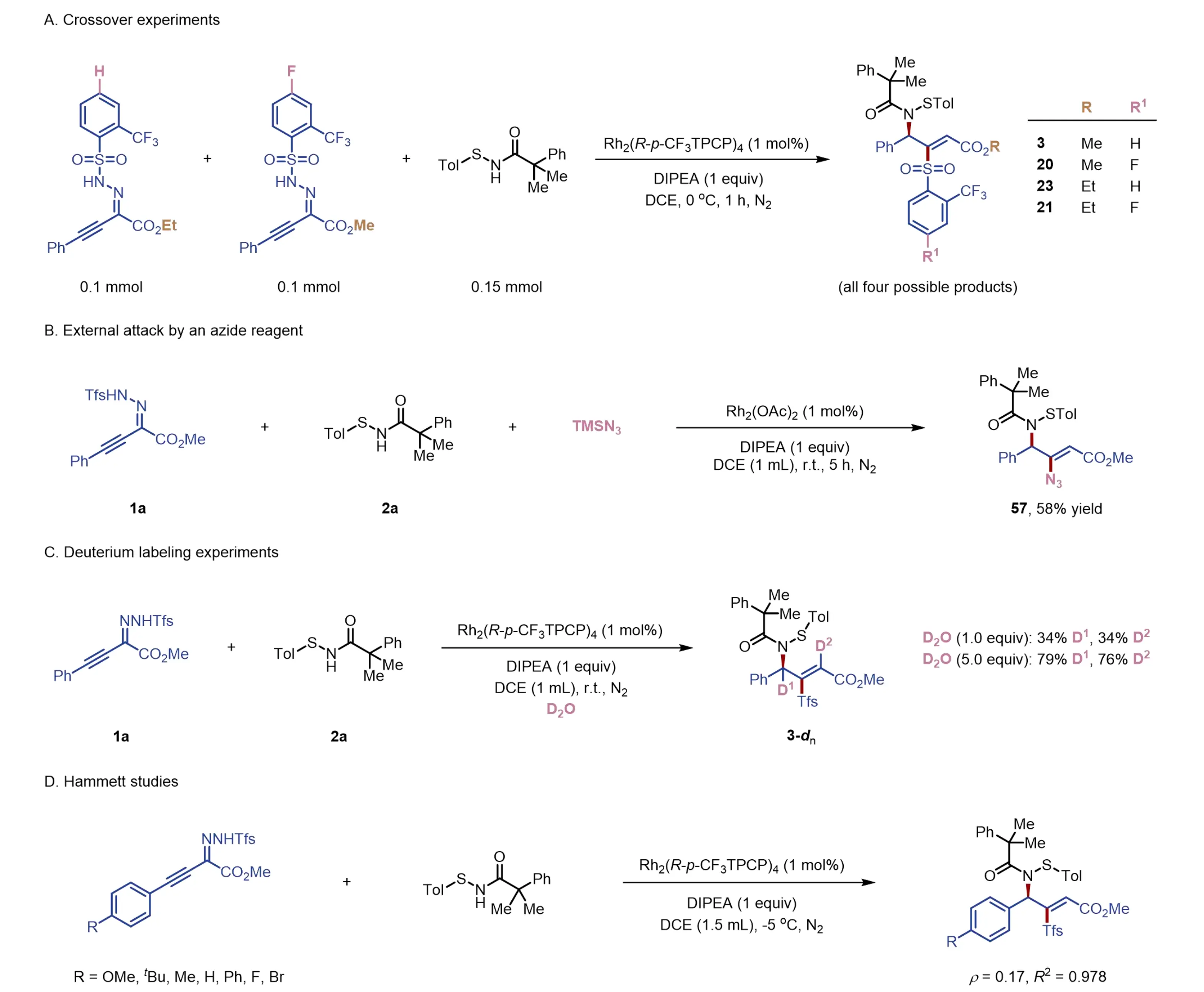 To shed light on the mechanism of this transformation, a series of experiments were conducted (Figure 4). To probe the crucial role of the sulfenamide moiety, various other NH nucleophiles, such as N-phenyl trifluoroacetamide, pivalamide, N-methoxyamide, or N-tosylamide, were tested as coupling reagents under standard reaction conditions. However, no desired product was observed in any of these cases (see Supplementary Materials). These results suggest that direct N–H insertion of amides is not facile, thereby highlighting the involvement of the sulfur atom in sulfenamide, potentially through the formation of a sulfur ylide or sulfilimine intermediate. A crossover experiment was also conducted using sulfenamide and two alkynyl sulfonylhydrozones differing in both the sulfonyl and ester groups. This reaction afforded all four possible products in comparable yields, as determined by 1H NMR, 19F NMR, and mass spectroscopy, possibly due to substrate crossover interactions (Figure 4A). This result reveals that the sulfonyl group fully dissociates during the reaction and subsequently undergoes intermolecular attack on an electrophilic species. To further support this conclusion, we carried out a control reaction of 1a and 2a in the presence of TMSN3 as an exogenous nucleophile (Figure 4B). Indeed, the alkenyl azide (57) was isolated in decent yield, demonstrating that the azide effectively outcompeted sulfinate as a nucleophile. Afterwards, deuterium labeling experiments were performed with D2O as an additive. Both the allylic and vinylic positions of the product were partially deuterated (Figure 4C). Notably, the degree of deuteration increased with higher amounts of D2O, suggesting that protonation occurs at these two positions in the catalytic cycle (vide infra). Finally, the electronic effect of the sulfonylhydrozone substrate was examined through Hammett studies. By varying the para-substituent on the phenyl ring, a linear correlation was observed with a small positive slope (ρ = 0.17, Figure 4D). This finding suggests that a negative charge may be stabilized in the transition state, potentially during the initial deprotonation-elimination stage or at a later stage of the reaction.