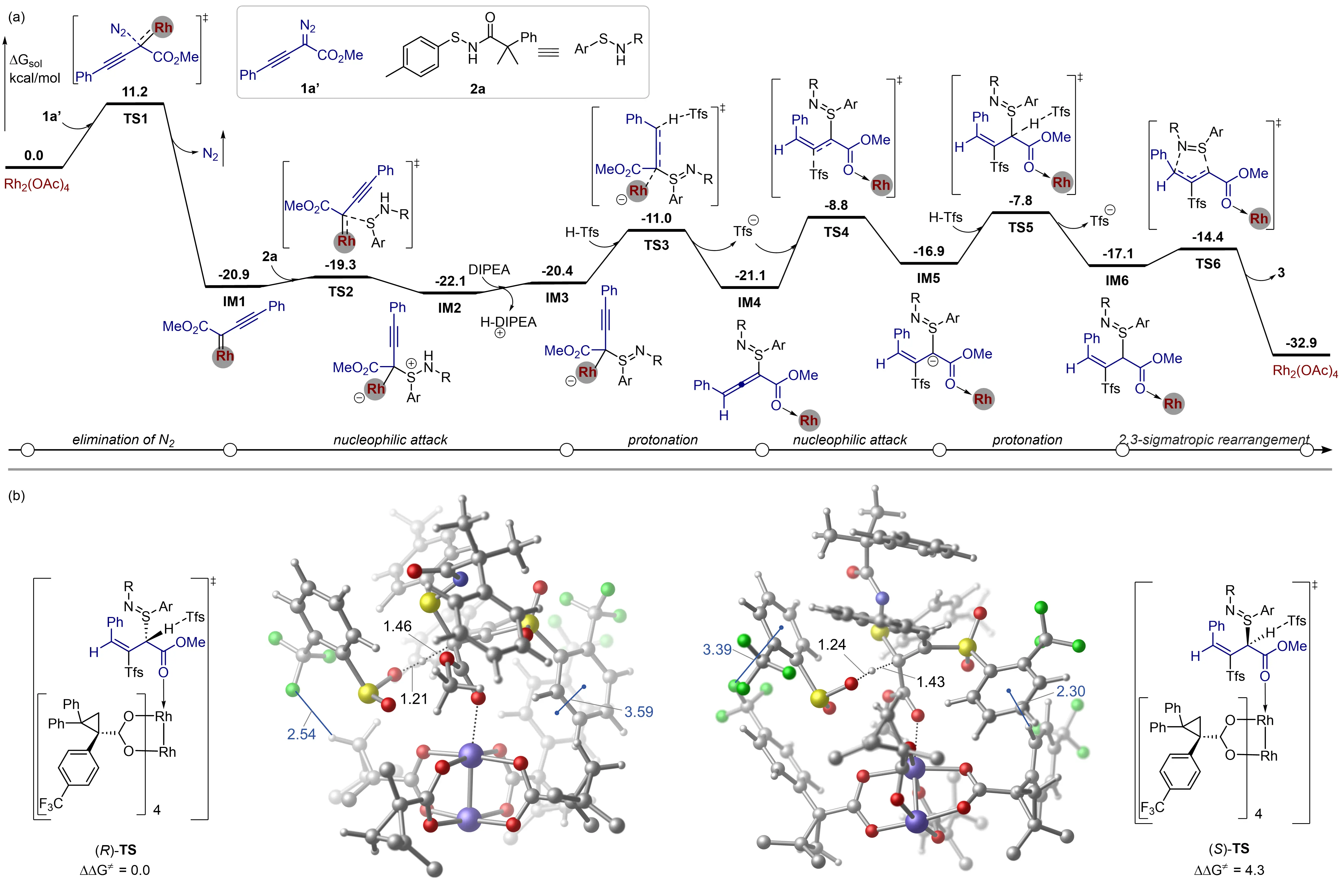To gain a comprehensive understanding of the detailed reaction mechanism and the origins of the enantioselectivity, density functional theory (DFT) calculations were performed at the level of B3LYP-D3(BJ)(SMD)/SDD&6-311+G(d,p)//B3LYP-D3(BJ)/SDD&6-31G(d). We selected sulfenamide 2a and the in situ generated diazo species 1a' as model substrates (Figure 5 and the Supplementary Materials). Rh2(OAc)4 was initially employed as the catalyst to establish the reaction mechanism, aiming to reduce computational costs. The calculated energy profile for the most favorable pathway leading to the formation of N-allylic sulfenamide 3 is shown in Figure 5A, with results for alternative pathways presented in the Supplementary Materials. The reaction begins with the elimination of N2 from diazo species 1a' via TS1, with an energy barrier of 11.2 kcal/mol,generating the alkynyl Rh-carbene IM1. Subsequent nucleophilic attack of sulfenamide 2a on the Rh-carbene via TS2 forms the zwitterionic Rh species IM2, which is kinetically accessible, with an energy barrier of only 1.6 kcal/mol relative to IM1. This zwitterionic Rh species IM2 then undergoes deprotonation by DIPEA to yield intermediate IM3. Protonation of IM3 at the alkynyl carbon by TfsH via TS3 delivers a Rh-allene intermediate IM4 along with a Tfs anion. The nucleophilic attack of Tfs anion on the central carbon of the allene occurs via TS4 to generate a stabilized enolate intermediate IM5, which is subsequently protonated via TS5 to afford S-allylic sulfilimine intermediate IM6. Consequently, IM6 undergoes a facile 2,3-sigmatropic aza-Mislow-Evans rearrangement via TS6, yielding the final product 3 and regenerating the Rh2(OAc)4 catalyst. Our calculations reveal that protonation of the enolate in IM5 constitutes the rate-determining step of the overall reaction, with an energy barrier of 14.3 kcal/mol relative to IM2.