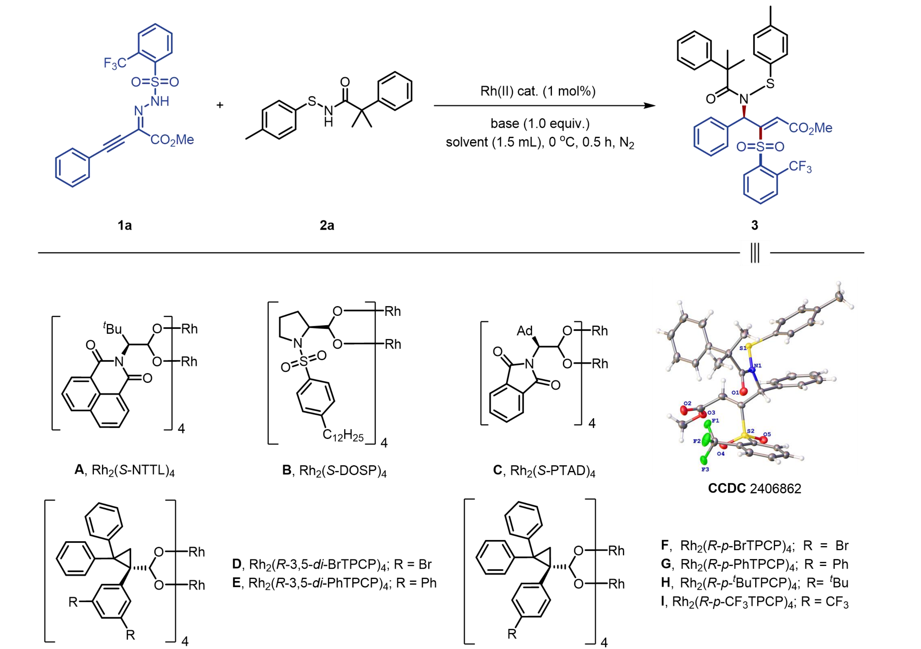 To evaluate the feasibility of our hypothesis, we examined the reaction between readily accessible α-phenylethynyl triftosylhydrazone (1a) and 2-methyl-2-phenyl-N-(p-tolylthio)propanamide (2a), employing various commercially available chiral dimeric Rh(II) tetracarboxylate complexes as catalysts in the presence of 4-cyclohexylmorpholine in dichloroethane (DCE) at 0 °C (Table 1). Initial experiments indicated that the chiral naphthaloyl-based dirhodium catalyst, Rh2(S-NTTL)4, provided the desired N-allylic sulfenamide 3 in low yield and enantioselectivity (Table 1, entry 1). Screening of multiple chiral dirhodium catalysts revealed that sterically hindered dirhodium catalysts substituted with triarylcyclopropanecarboxylate afforded higher enantioselectivities (entries 4-9), among which Rh2(R-p-CF3TPCP)4 provided the highest yield (80%) and enantioselectivity (87% ee, entry 9). However, chiral dirhodium catalysts with N-sulfonylprolinate ligand, Rh2(S-DOSP)4 or phthalimide ligand, Rh2(S-PTAD)4, resulted in lower yields and enantioselectivities. Substituting the base 4-cyclohexylmorpholine with DIPEA further enhanced both the efficiency and enantioselectivity (entry 10). Using N,N-diethylcyclohexylamine as the base (entry 13) afforded only modest yield and enantioselectivity of desired product 3, whereas an inorganic base (e.g., NaH) inhibited the reaction (entry 14). Reducing the amount of DIPEA from 1.0 equiv to 0.1 equiv yielded the desired product 3 in less than 10% yield with 77% enantiomeric excess (entry 11). The replacement of dichloroethane with dichloromethane as the solvent slightly decreased both the yield and enantioselectivity (entry 12). The proposed structure and (R,Z)-configuration (CCDC 2406862) were confirmed by single-crystal X-ray crystallography analysis of product 3.