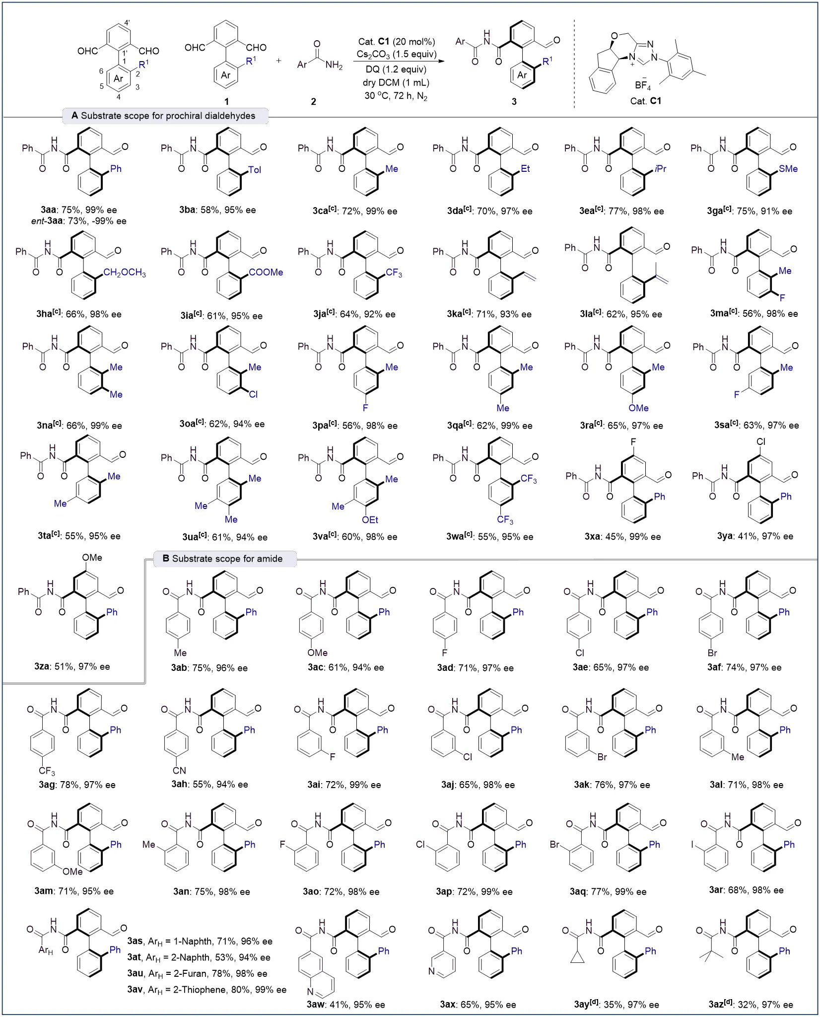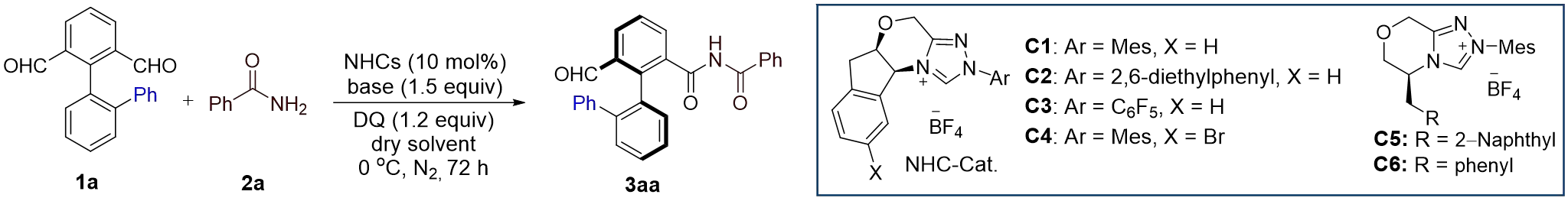 To validate our hypothesis, we initiated the investigation using biaryl dialdehyde 1a as a model axially prochiral substrate and benzamide 2a as the amidation reagent to identify optimal reaction conditions. Key optimization results are summarized in Table 1. In the initial trial, treatment of 1a (0.1 mmol) with 2a (3.0 equiv) and DQ (1.2 equiv) in DCM (1.0 mL), catalyzed by the aminoindanol-derived precatalyst C1 (10 mol%) bearing an N-mesityl group at 0 °C under a N2 atmosphere for 72 h, afforded the desired amidation product 3aa with excellent enantioselectivity, albeit in low yield (Table 1, entry 1). Several solvents, including CHCl3, THF, and MTBE, supported the transformation but were less effective than DCM (entries 2-4). The use of MeCN improved the yield at the cost of reduced enantioselectivity (entry 5). After evaluation, DCM was selected as the optimal solvent for further parameter screening. Alternative organic (DBU) and inorganic bases (K2CO3, K3PO4) proved inferior (entries 6-8). Notably, raising the temperature to 30 °C improved both the yield (50%) and enantioselectivity (99% ee, entry 9). We next examined structural variations of the NHC catalyst. Replacing the N-mesityl group in C1 with the sterically more hindered tri-ethyl-phenyl group (C2) led to a lower yield (34%) with no significant change in enantioselectivity (entry 10). The more electron-deficient pentafluorophenyl-substituted catalyst C3 was ineffective (entry 11). Catalyst C4, featuring a bromo-substituted indanol ring, provided 3aa in 40% yield and 99% ee (entry 12). Aryl-alanine-derived catalysts C5 and C6 did not improve the outcome (entry 13 and 14). Finally, increasing the catalyst loading to 20 mol% markedly enhanced the conversion, delivering 3aa in 75% yield with retained enantioselectivity (99% ee, entry 15). Accordingly, the conditions in entry 15 were established as the standard for subsequent studies.