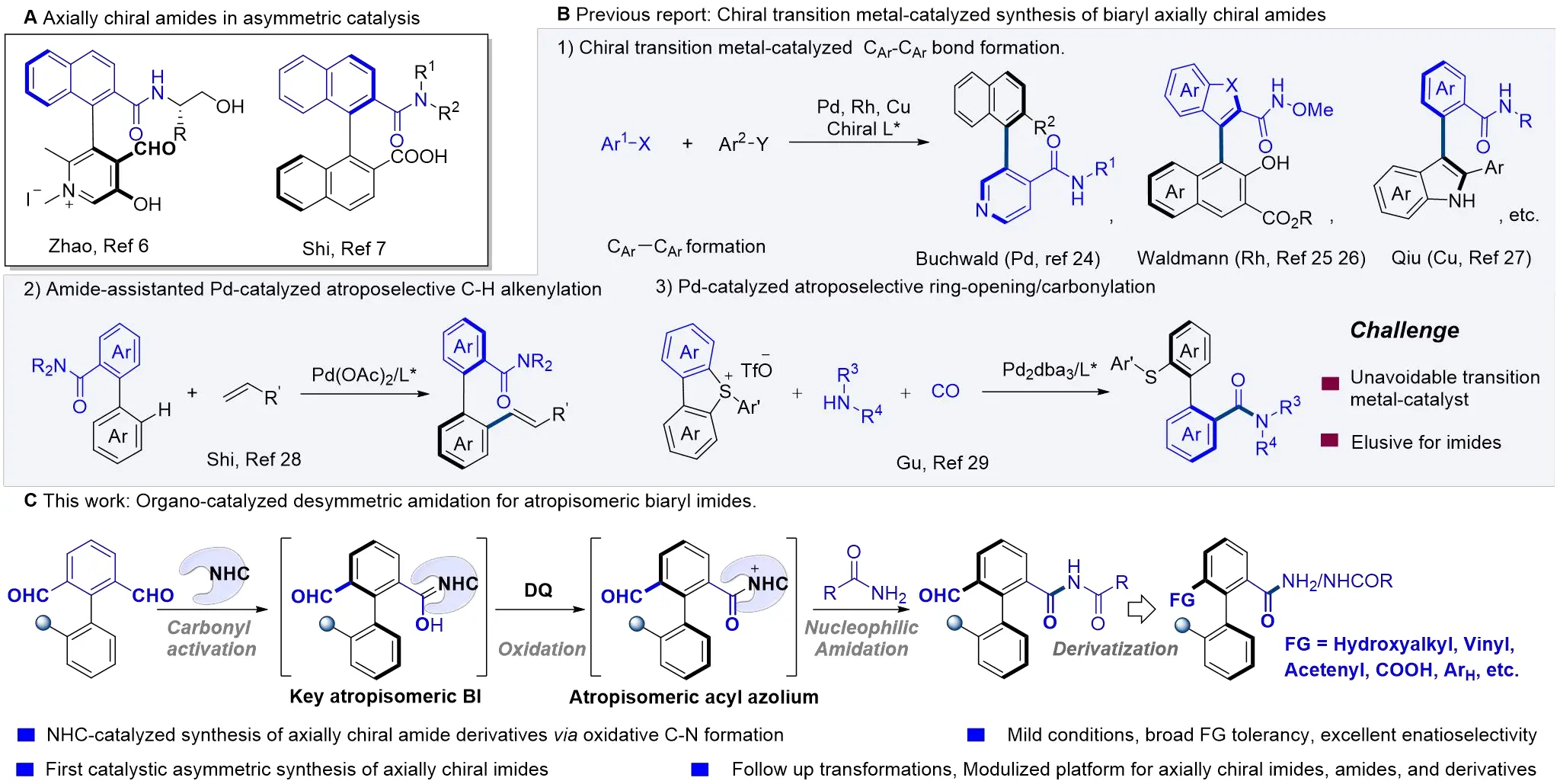 The unique capability of N-Heterocyclic carbenes (NHCs) to activate carbonyl group has made them extensively utilized in organic synthesis and asymmetric catalysis[30-41]. Desymmetrization[42-46], that disrupts symmetry to convert meso or prochiral compounds into enantiomerically enriched products, offers an attractive and efficient strategy for constructing complex chiral molecules. Systematic work by Chi[47-50], Veselý[51], Biju[52], Ye[53], and our group[54,55] has demonstrated the utility of NHC-catalyzed enantioselective desymmetrization of prochiral dialdehydes, enabling access to carbonyl compounds bearing central[47-49], planar[50,51], and axial[52-68] chirality. Mechanistically, NHC catalysis generates chiral Breslow intermediates from dialdehydes, which then undergo functionalization to afford enantioenriched products. We envisioned that NHC-catalyzed desymmetrization of axially prochiral biaryl dialdehydes could provide a viable route to challenging asymmetric amidations[69-77] with high reactivity and selectivity. However, several obstacles must be overcome: (1) precise modulation of nucleophilicity is essential to avoid condensation between the aminating reagent and the aldehydes; and (2) over-functionalization of the dialdehyde substrates must be controlled. As part of our continuous research in NHC catalysis[78-83] and axial chirality [54,55,64,67,84], we herein report the first enantioselective synthesis of axially chiral biaryl imides via NHC-catalyzed desymmetrizative amidation of biaryl dialdehydes with amines (Scheme 1C).