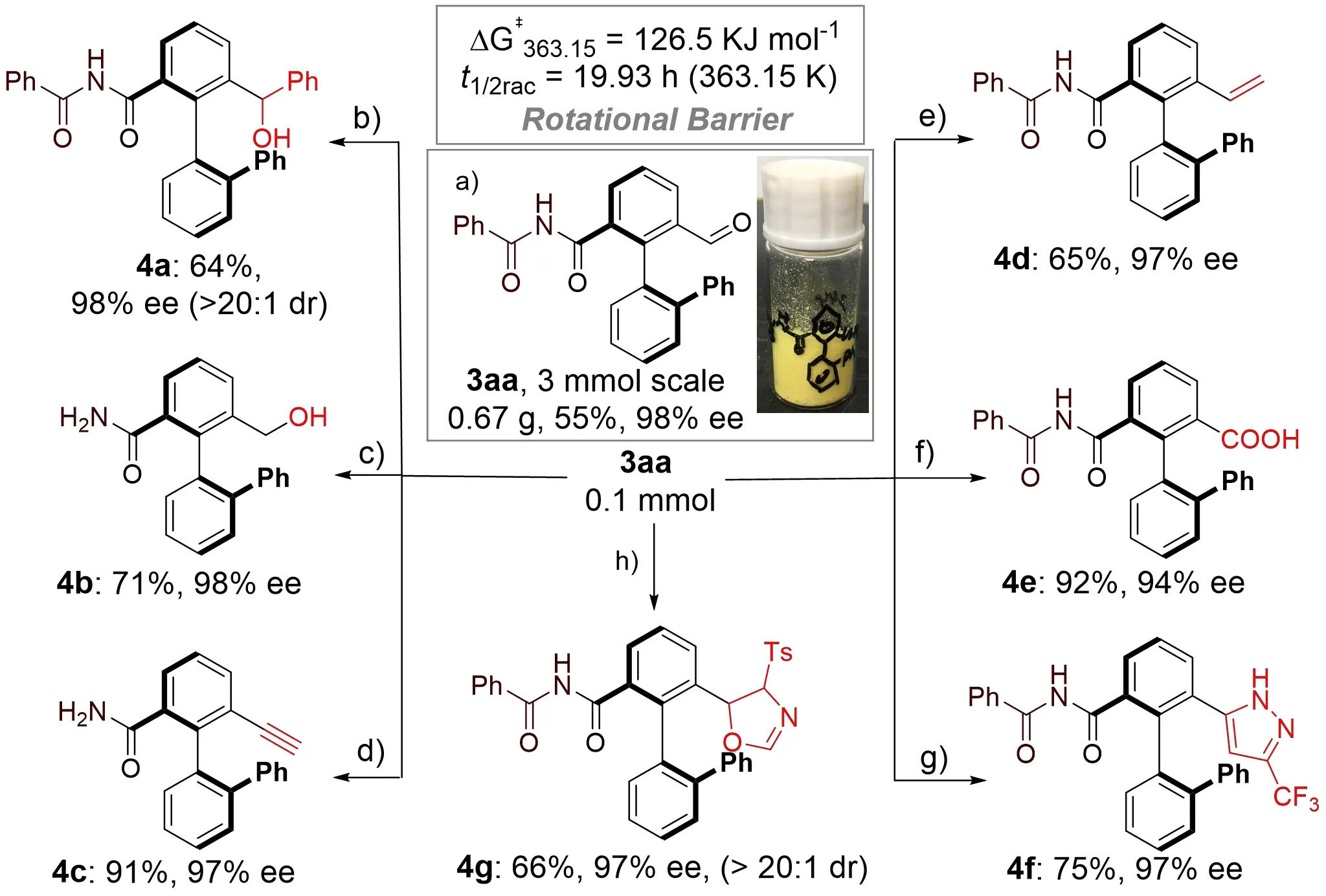 To further demonstrate the synthetic utility of the enantioselective oxidative amidation system, gram-scale synthesis and derivatization were carried out. The reaction was conducted on a 3.0 mmol scale, affording (R)-3aa in 55% yield (0.67 g) with 98% ee (Scheme 3a). This reduction in yield is presumably due to the poor solubility of the amide, creating a heterogeneous mixture. In the larger-scale setup, this inhomogeneity likely caused the amide to precipitate and settle at the bottom of the flask, thereby compromising the reaction efficiency. The formyl and imine groups serve as highly versatile functional handles for further transformations. For instance, diastereoselective nucleophilic addition of PhMgBr to 3aa yielded axially chiral secondary alcohol 4a with 65% yield, 98% ee, and > 20:1 dr (Scheme 3b). Reduction of the formyl group in 3aa with NaBH₄, followed by cascade hydrolysis of the imide, provided axially chiral alcohol 4b in 71% yield and 98% ee (Scheme 3c). Seyferth-Gilbert homologation of 3aa produced alkynyl-containing axially chiral amide 4c in 91% yield and 97% ee (Scheme 3d), while a Wittig reaction delivered alkenyl-substituted axially chiral imide 4d in 65% yield and 97% ee (Scheme 3e). Oxidation of the formyl group afforded valuable axially chiral carboxylic acid 4e in 92% yield, albeit with slightly reduced enantioselectivity (Scheme 3f). Cascade annulation of 3aa with TsNHNH₂ and 2-bromo-3,3,3-trifluoropropene yielded pyrazole 4f (Scheme 3g), and cycloaddition with tosylmethyl isocyanide furnished product 4g in 66% yield and 97% ee with excellent diastereoselectivity (Scheme 3h). The rotational barrier of the C(aryl)–C(aryl) bond in 3aa was determined to be ΔG‡rac = 126.5 kJ/mol, corresponding to a half-life of 19.9 hours at 90 °C in i-PrOH. This high configurational stability ensures significant chiral retention during subsequent transformations, establishing a robust strategy for the synthesis of axially chiral imides, amides, and related derivatives.