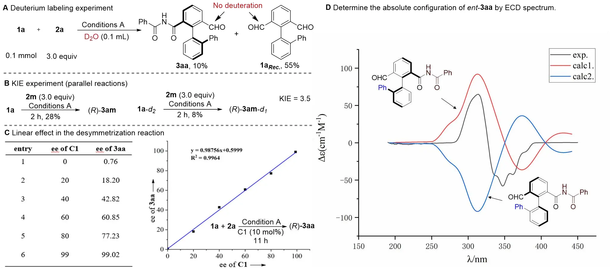 We carried out a series of mechanistic studies to elucidate the reaction pathway. Deuterium labeling experiments showed that no deuterium was incorporated into either the product or the recovered starting materials (Scheme 4A), suggesting that cleavage of the aldehyde C–H bond is irreversible under the reaction conditions. The kinetic isotope effect (KIE) was measured through parallel reactions of 1a and 1a-d₂ with 2m over 2 hours, yielding a KIE value of 3.5 (Scheme 4B). This result indicates that C–H bond cleavage is likely involved in the rate-determining step. Furthermore, the absence of nonlinear effects, as shown in Scheme 4C, supports the participation of a single chiral catalyst molecule in the enantioselectivity-determining step. The absolute configuration of the products was determined by electronic circular dichroism analysis of ent-3aa, which was assigned as S (Scheme 4D). Accordingly, the absolute configurations of all other products were assigned by analogy as R. Considering that no bisubstituted byproducts were detected in the reaction system, we conclude that the enantioselectivity is primarily governed by a desymmetrization process, although a minor contribution from kinetic resolution to the slight enhancement of the ee value cannot be entirely ruled out (Figure S1). Finally, we propose a plausible reaction mechanism, as depicted in Figure S2. It commences with the desymmetrizing nucleophilic addition of the NHC to the dialdehyde, followed by a 1,2-HAT to generate the key Breslow intermediate. This intermediate subsequently undergoes oxidation and, finally, a nucleophilic amination to construct the axially chiral imide scaffold.