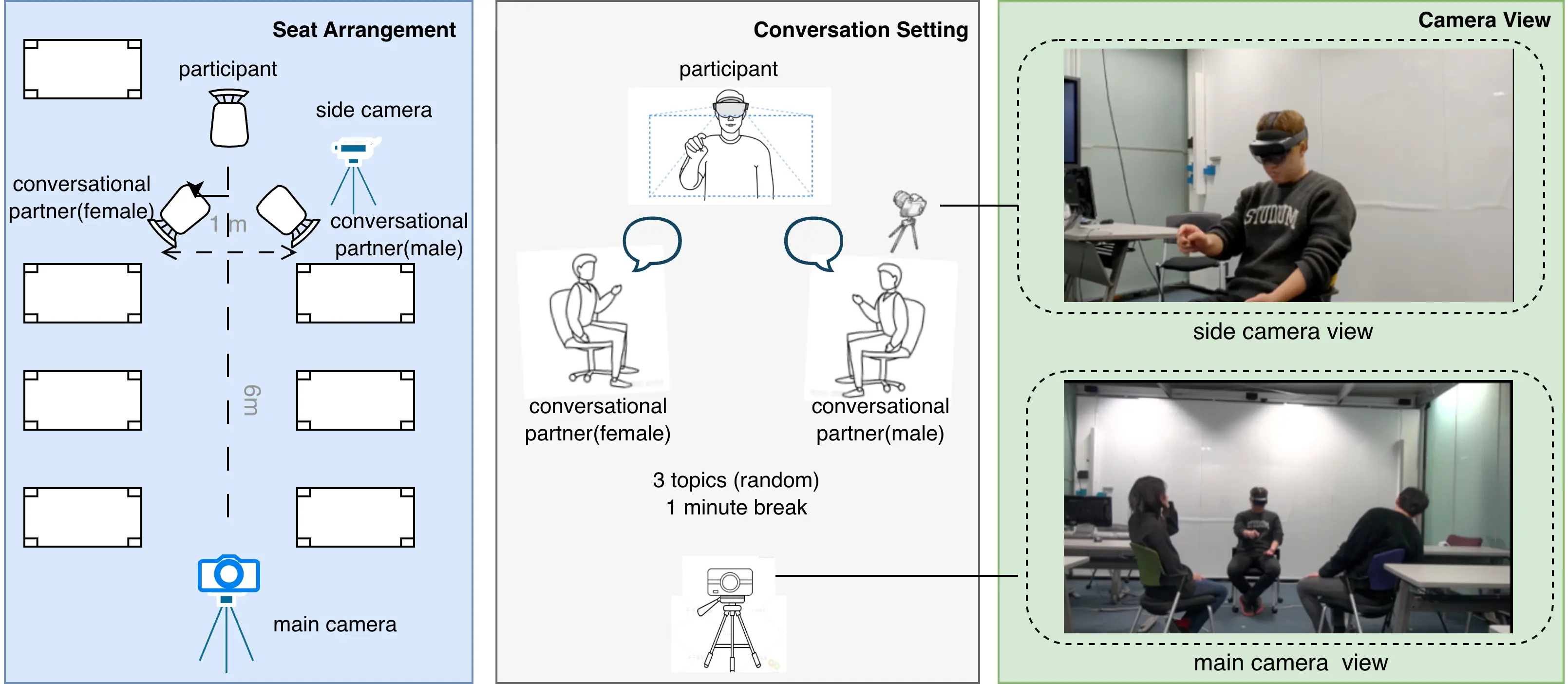The experimental site was a quiet conference meeting room with consistent lighting and noise conditions. Three people were arranged in each round of the experiment: two conversational partners and one subject as a listener. The three seats were arranged in an equilateral triangle, with the subject facing the camera. See Figure 1 for the specific arrangement. The listener wore a Microsoft HoloLens 2, and the two conversational partners were placed in front of the participant at a distance of about 6 meters. In order to fully record the experimental process, this study set up a Nikon high-definition camera 5 meters in front of the subject for overall image acquisition, and placed a side camera (recorded from a mobile phone, Google Pixel 6a) on the left side of the subject for local close-ups. The side camera was operated by the conversational partner seated on the right.