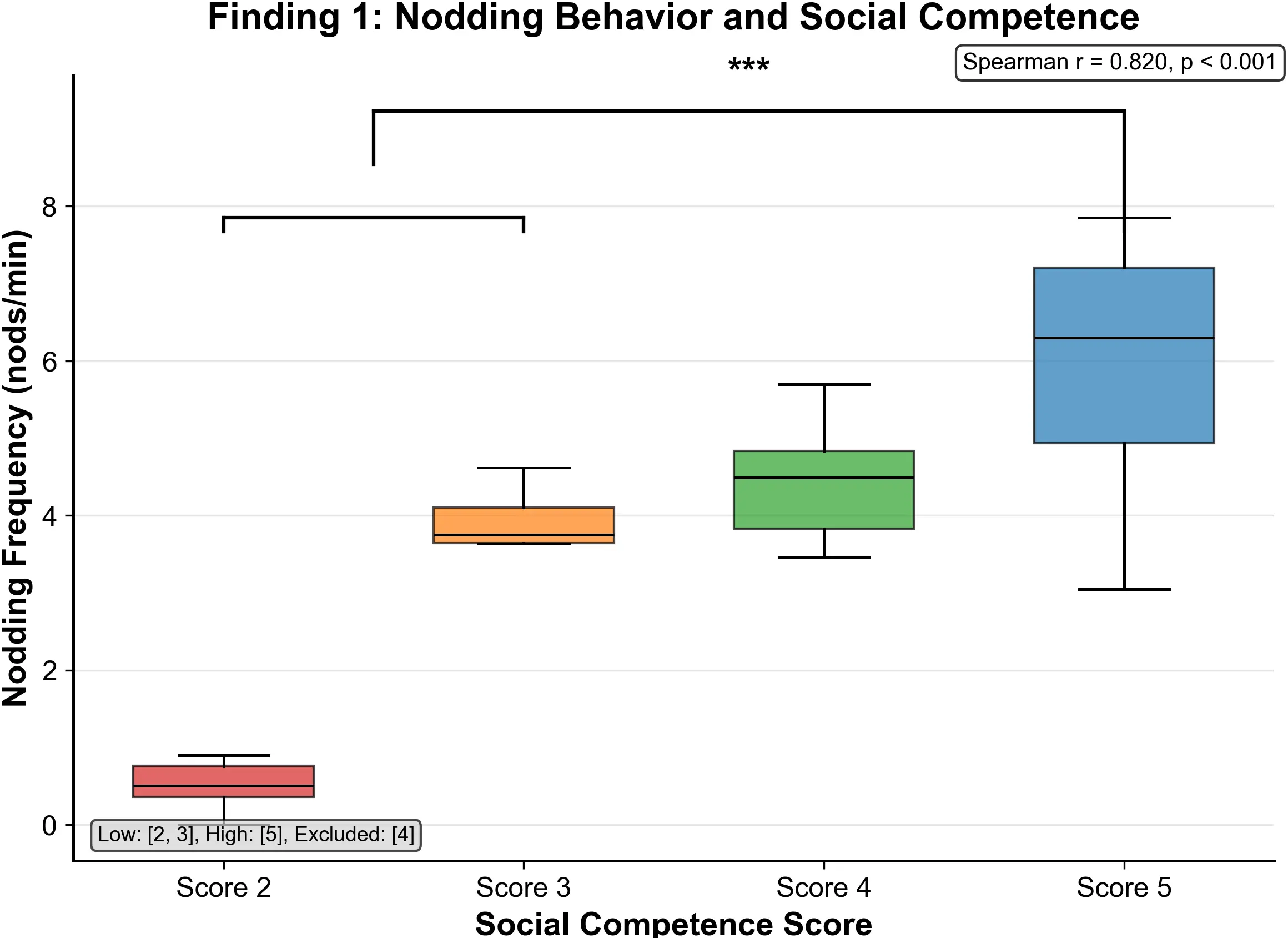 RQ1: Does nodding frequency, as a critical nonverbal feedback behavior that signals understanding and social reciprocity, correlate with social competence levels?