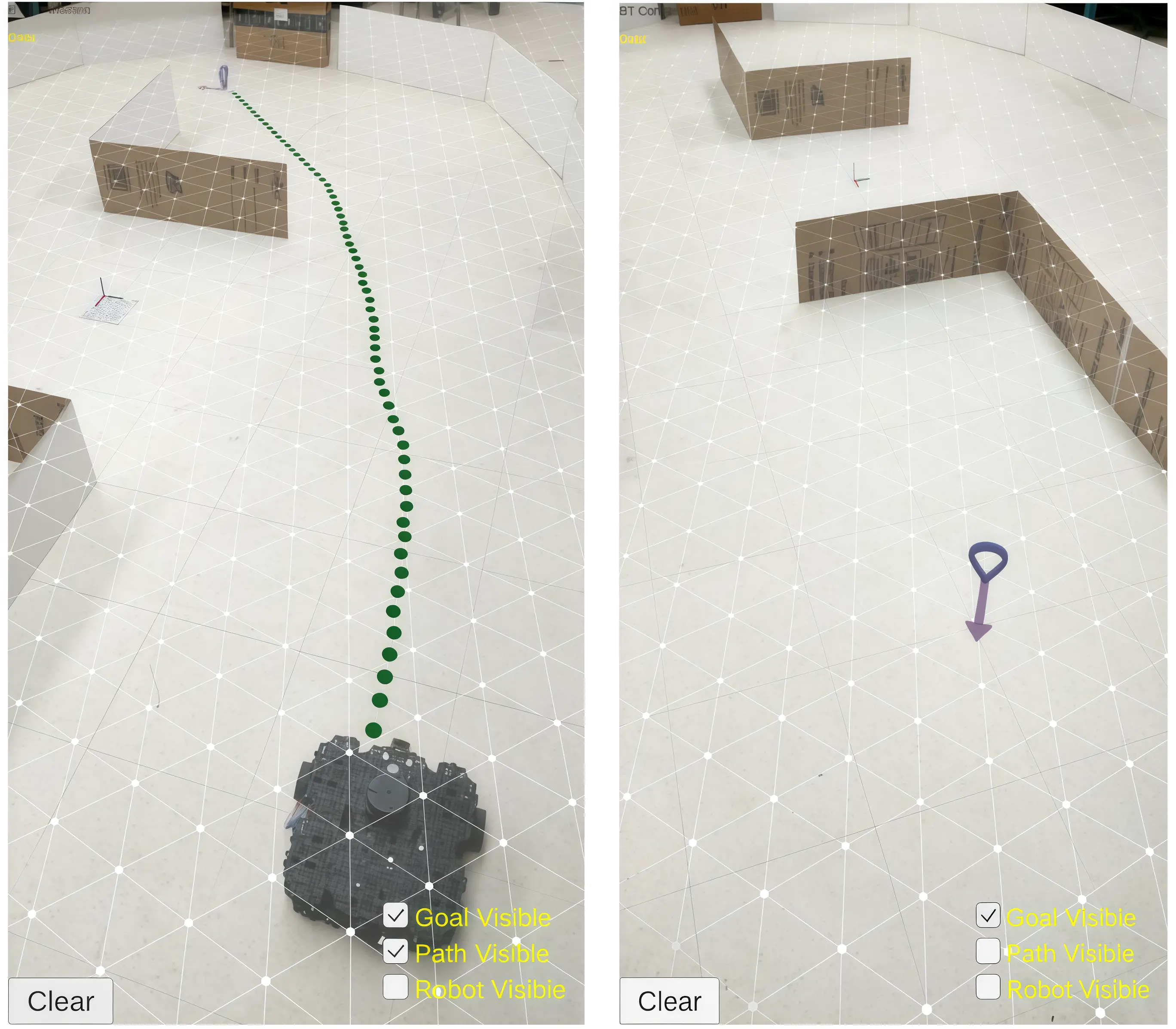 When a new goal is selected for the robot, a navigation path to the selected target coordinate is computed based on the cost map[28] of the area. If the Path Visible option is enabled in the AR interface, the ROS topic/move base/NavfnROS/plan is subscribed by the ROS node, and waypoint coordinates are sent to the AR application. The waypoints of the planned trajectory are represented by the green virtual sphere objects rendered in the AR scene as shown in Figure 1a.