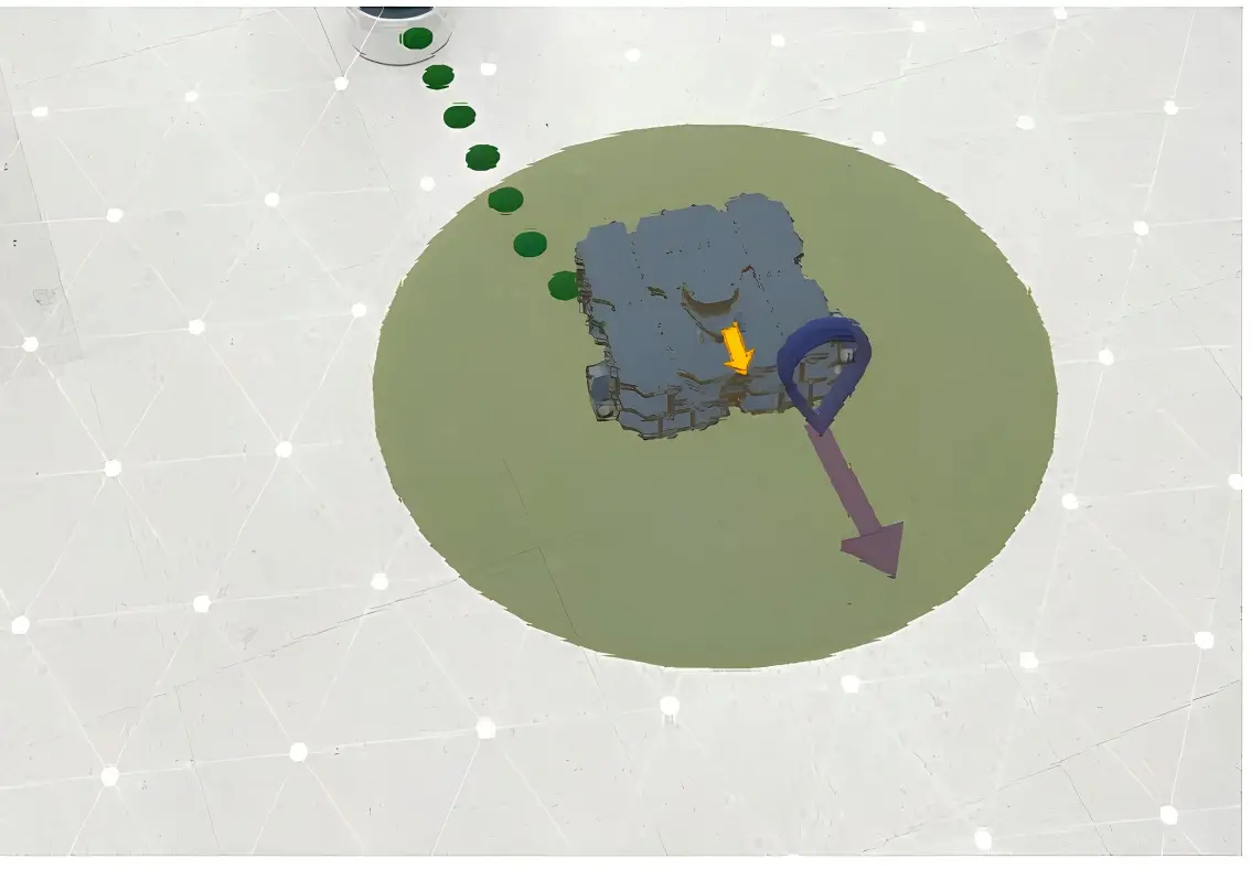 Figure 2. AR visualization of a virtual robot navigation simulation, showing the planned trajectory (green dots), the robot’s final pose with orientation (arrow), and the safety buffer zone (yellow circle) around the virtual robot. An obstacle positioned near the path illustrates how spatial relationships and potential collision regions are conveyed to the user in the augmented scene. AR: augmented reality.