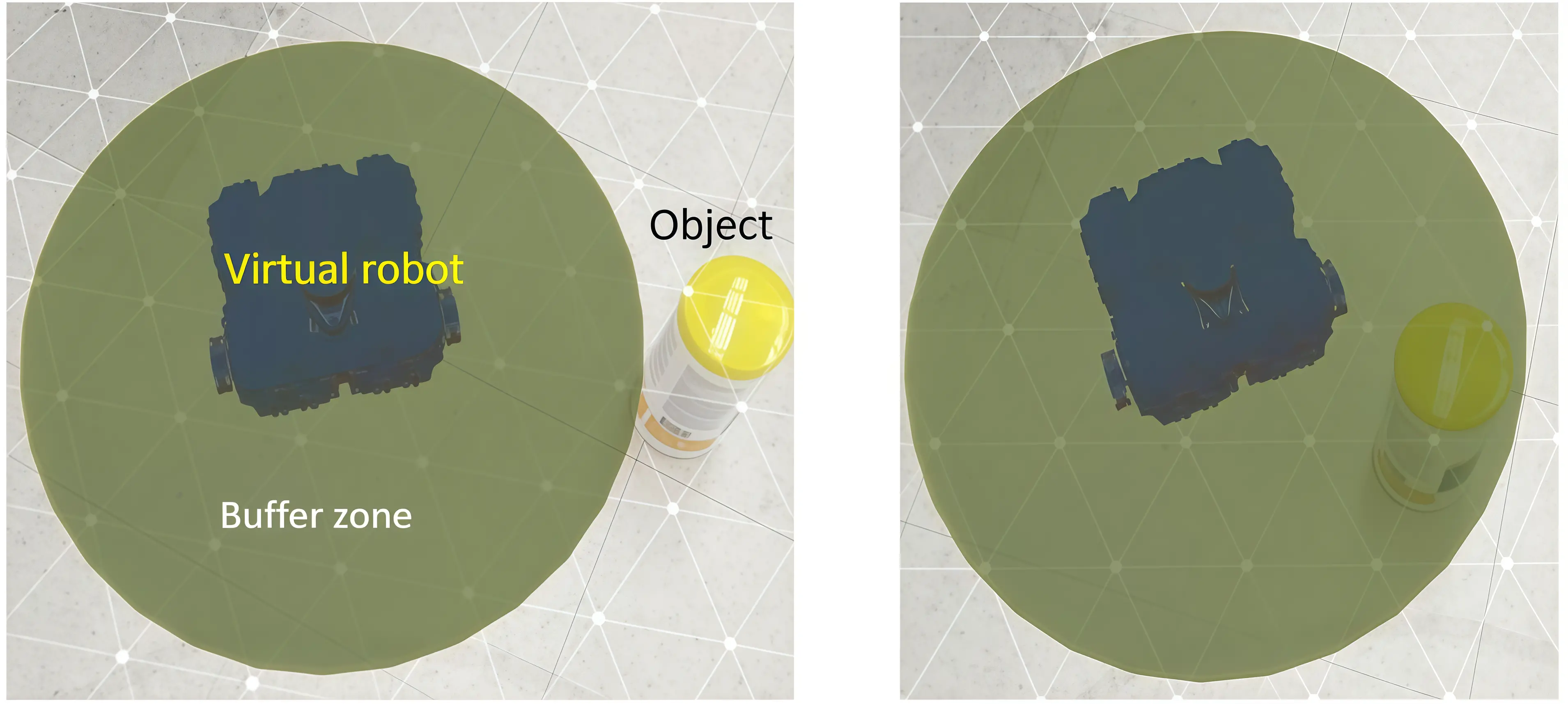 Figure 3. AR visualization of a safety buffer region around the virtual robot. (a) Left: When the object appears outside the buffer region, the robot is considered unobstructed; (b) Right: The object is located inside the buffer zone, representing a potential obstruction. AR: augmented reality.