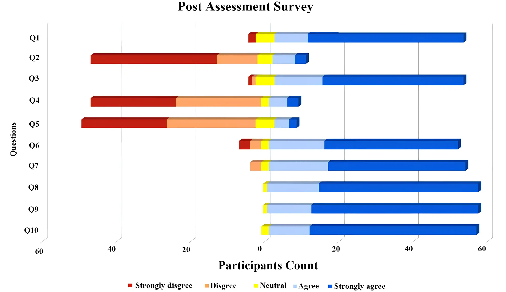 Following the SAGAT assessment, a post-assessment survey was administered to gather participants’ self-ratings of SA and their perceptions of the AR visualization interface. The survey consisted of 10 items on a 5-point Likert scale, including seven positively directed statements and three negatively directed statements. Figure 4 summarizes the distribution of participant responses.
