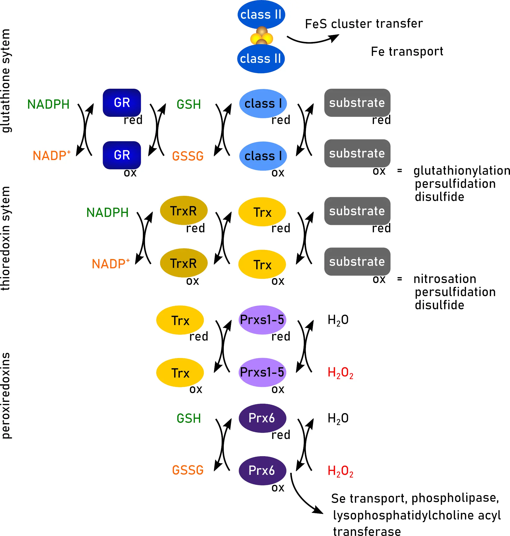 Figure 1. Functions of redoxins. Trx, glutaredoxins (class I and class II), and Prx display overlapping and different functions. Created in inkscape. Trx: thioredoxin; Prx: peroxiredoxin; GR: glutathione reductase; GSH: glutathione; GSSG: GSH disulfide; NADPH: reduced nicotinamide adenin dinucleotide phosphate; NADP+: oxidized nicotinamide adenin dinucleotide phosphate; red: reduced; ox: oxidized.