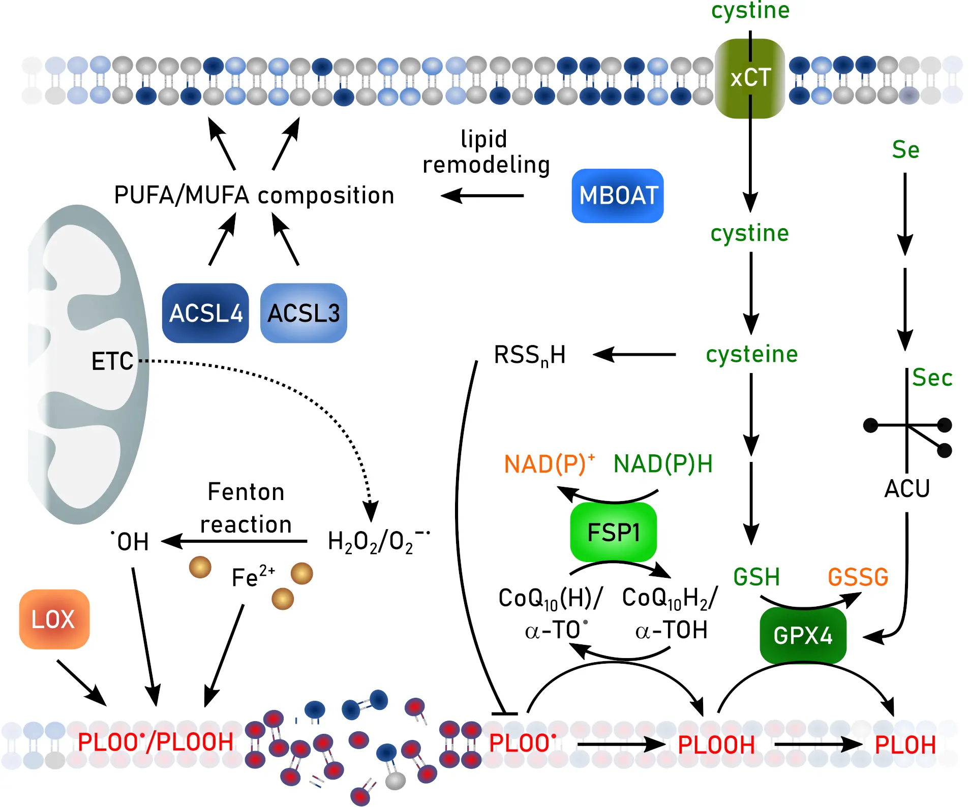 Ferroptosis sensitivity is strongly influenced by the fatty acid composition of phospholipids. Acyl-CoA synthetase long-chain family member 4 (ACSL4) preferentially activates polyunsaturated fatty acids such as arachidonic and adrenic acids, forming acyl-CoA derivatives that are incorporated into phosphatidylethanolamine (PE) by membrane-bound O-acyltransferases (MBOATs)[84,85]. These PUFA-PE species are particularly vulnerable to peroxidation and act as key executioner lipids in ferroptosis. Cells lacking ACSL4 or MBOAT1/2 exhibit decreased levels of PUFA-phospholipids and display marked resistance to ferroptosis. Thus, ACSL4 and MBOAT enzymes define a lipid metabolic landscape that determines whether a cell is predisposed to ferroptotic cell death.
