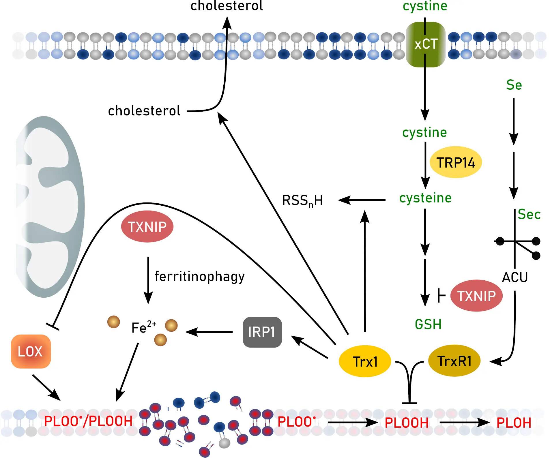 Figure 3. Functions of the Trx system and TXNIP or TRP14 in ferroptosis. Created in inkscape. Trx: thioredoxin; TXNIP: Trx-interacting protein; TRP14: thioredoxin-related protein of 14 kDa; GSH: glutathione; IRP: iron regulatory protein; LOX: lipid oxidase.