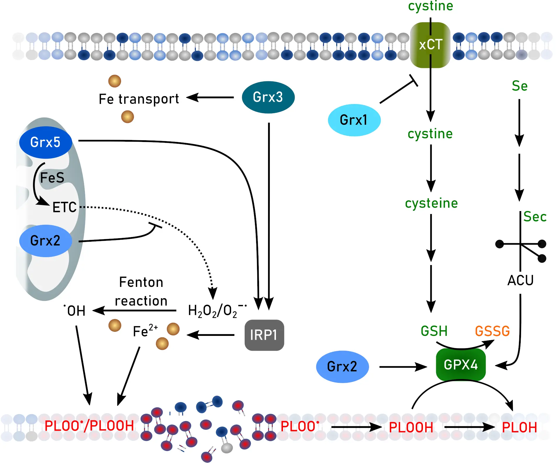 Figure 4. Functions of Grxs in ferroptosis. Created in inkscape. Grx: glutaredoxin; ETC: electron transport chain; GSH: glutathione, GSSG: GSH disulfide; IRP: iron regulatory protein.