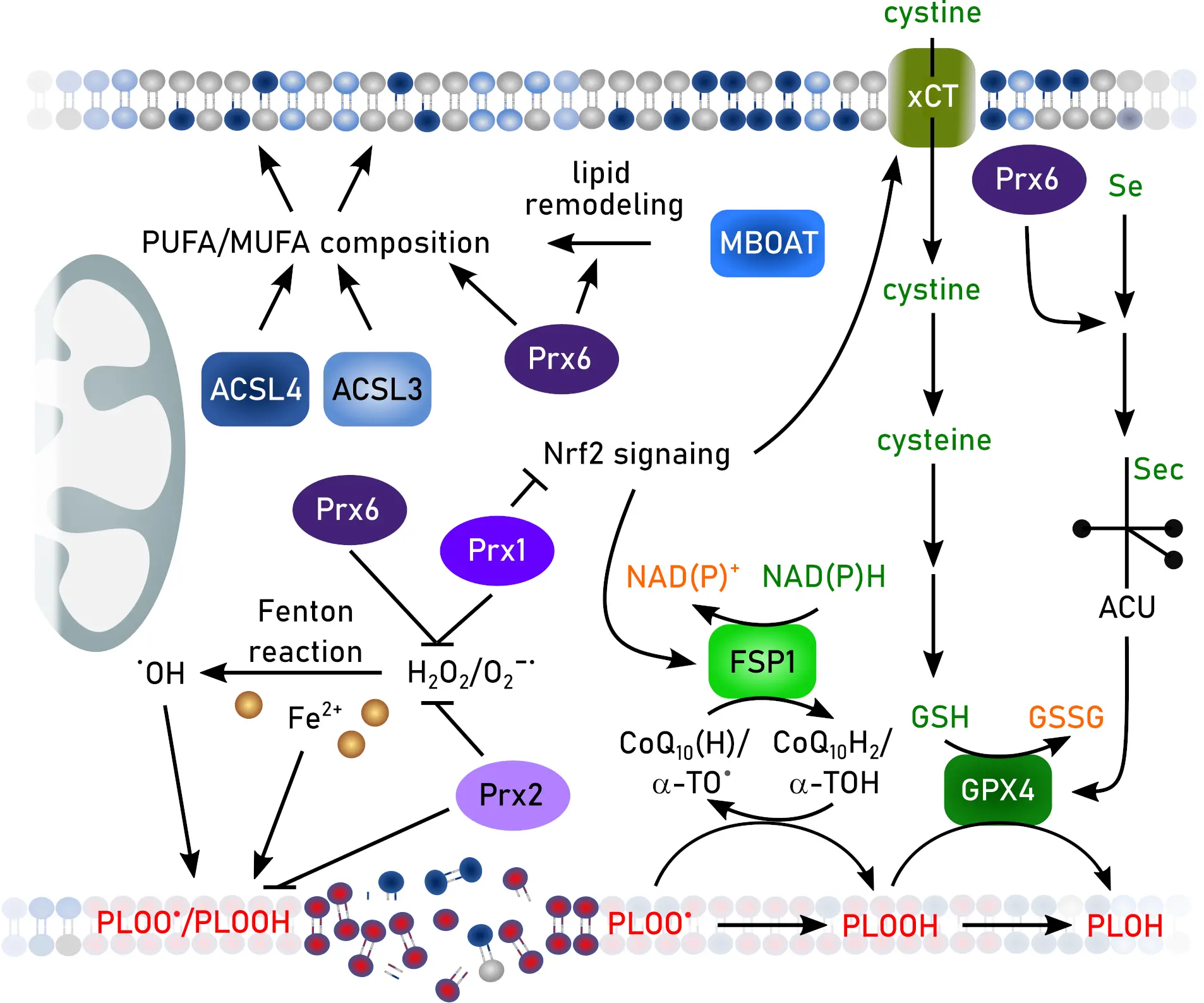 Figure 5. Functions of Prxs in ferroptosis. Created in inkscape. Prx: peroxiredoxin; ACSL3: synthetase long-chain-fatty-acid family member 3; ACSL4: acyl-CoA synthetase long-chain-fatty-acid family member 4; α-TO: α-tocopherol/vitamin E; CoQ10: co-enzyme Q10; FSP: ferroptosis suppressor protein; GSH: glutathione; GSSG: GSH disulfide; GPX: GSG peroxidase; MBOAT: membrane-bound O-acetyltransferase; MUFA: mono-unsaturated fatty acid; NADPH: reduced nicotinamide adenin dinucleotide phosphate; NAD(P)+: oxidized nicotinamide adenin dinucleotide (phosphate), Nrf2: nuclear factor erythroid 2-related factor 2; PUFA: poly-unsaturated fatty acid.