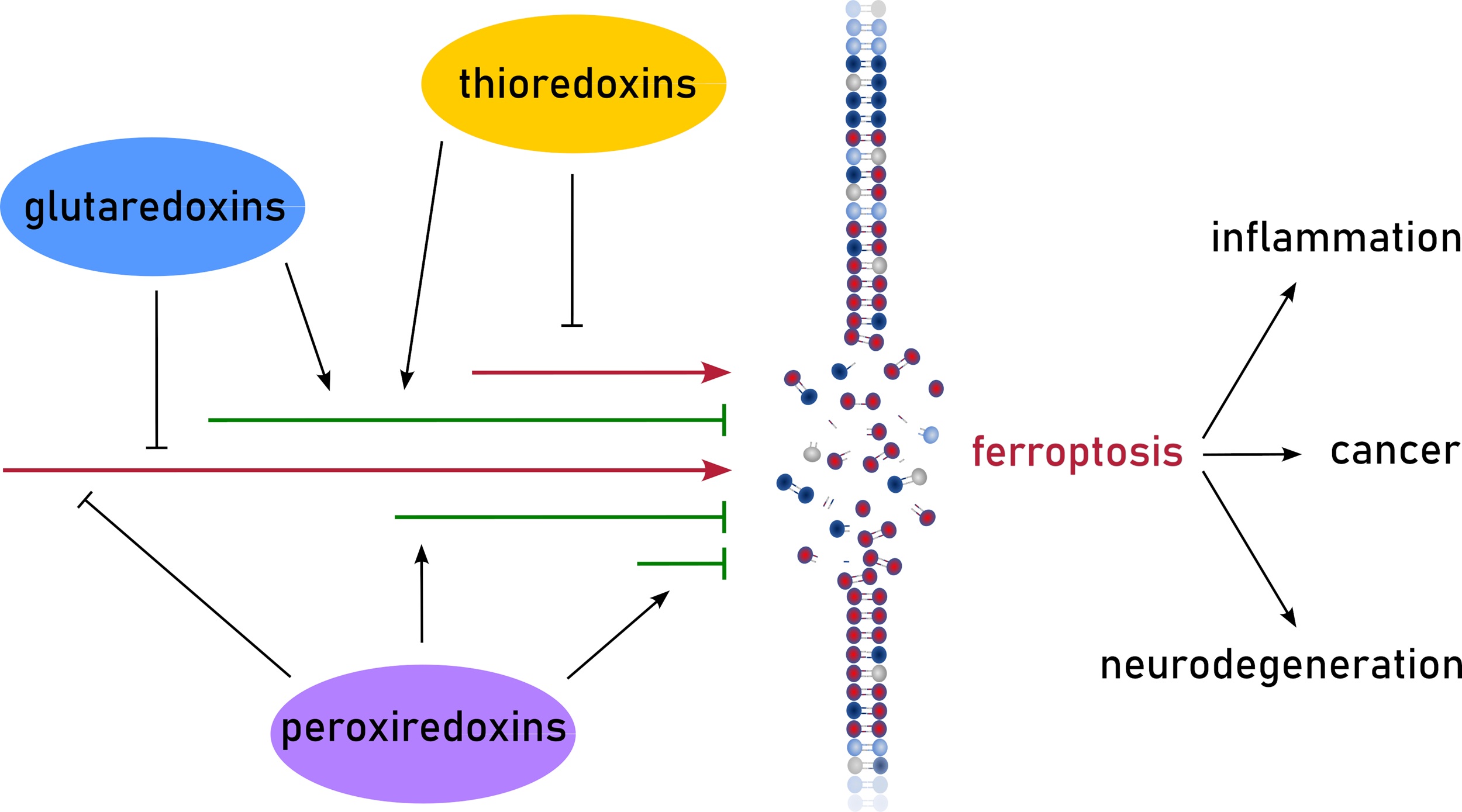 Several diseases are linked to both ferroptotic cell death and (mis-)function of redoxins. Redoxins contribute to diseases mainly in their roles as regulators of iron homeostasis and of redox signaling by modulating oxidative posttranslational modifications and/or levels of oxidants.