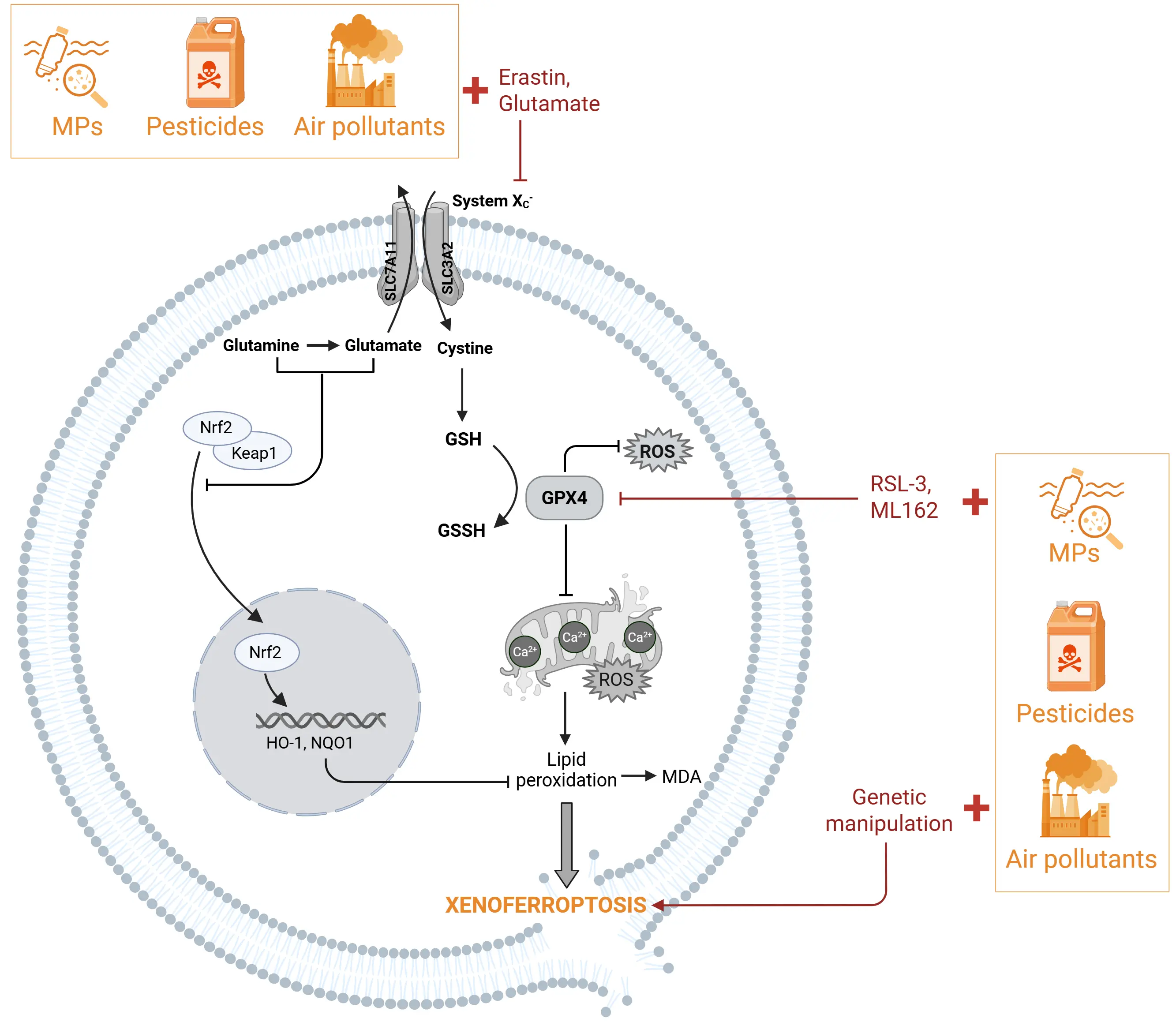 Figure 1. Xenoferroptosis can be induced by external environmental challenges. Xenoferroptosis is initiated by a combination of sub-lethal concentrations of environmental challenges, such as particulate matters (air pollution), pesticides, or MNPs with sub-toxic doses of ferroptosis inducers or low expression of ferroptotic-associated proteins. Environmental stressors (shown in yellow) in cells primed to ferroptosis by specific inducers (shown in red) like glutamate or erastin will initiate and accelerate the cell death through inhibition of the NRF2 pathway. In addition, environmental stressors in the presence of sub-toxic doses of ferroptosis inducers (RSL3, Erastin, ML162) initiate cell death through inhibition of GPX4. Eventually these double-hit challenges converge in aggravated ferroptotic changes like increased lipid peroxidation leading to xenoferroptotic cell death. Created in BioRender. MNPs: micro(nano)plastics; NRF2: nuclear factor E2-related factor 2; RSL3: RAS-selective lethal 3; ML162: molecule library 162; GPX4: glutathione peroxidase 4; MPs: microplastics.