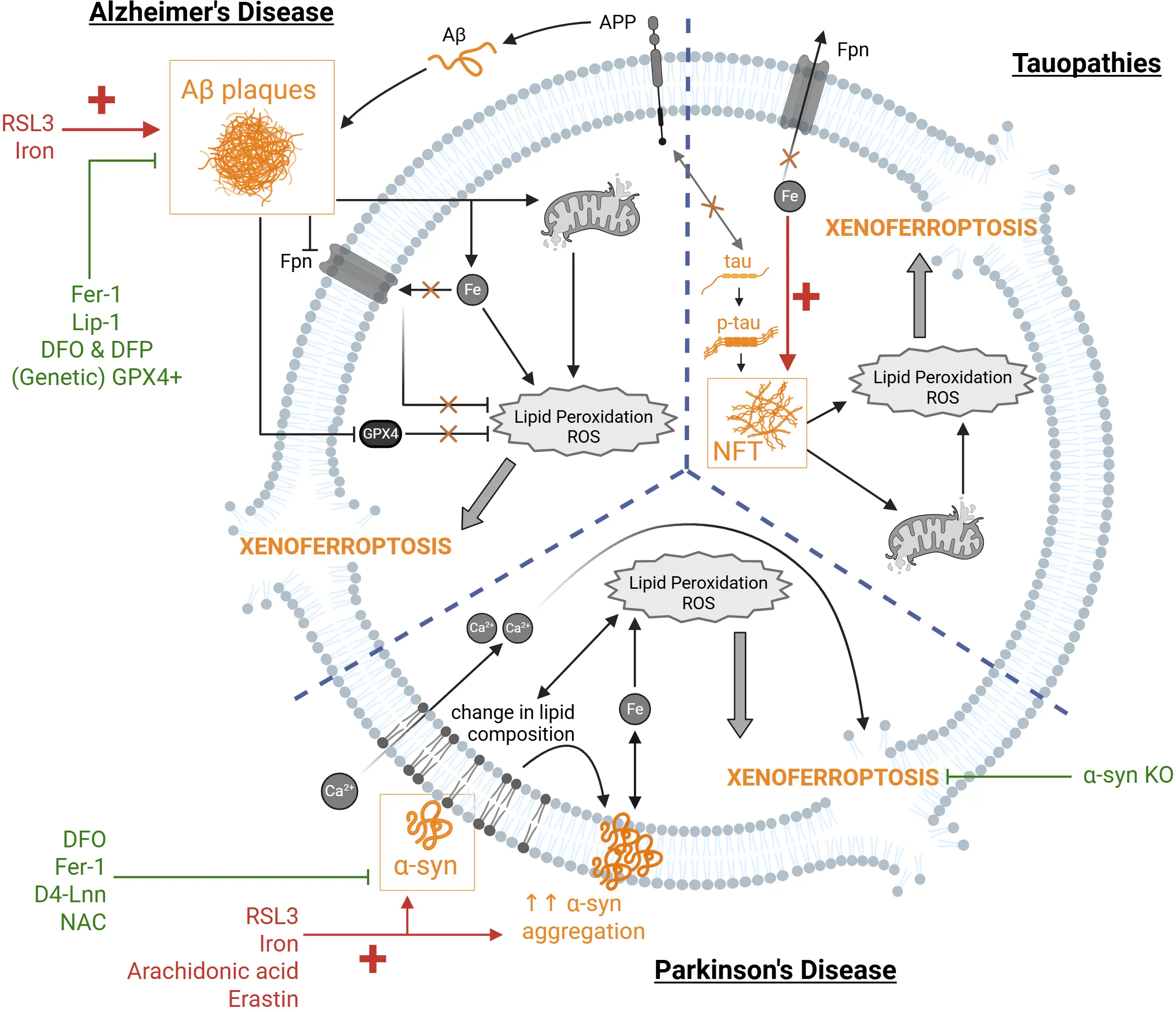 Figure 2. Xenoferroptosis in neurodegenerative diseases triggered by protein aggregates. Protein aggregates (shown in yellow) can represent the second hit trigger as endogenous stimuli for xenoferroptosis. In the context of AD, Aβ aggregates, formed as a result of impaired APP function, in combination with ferroptosis inducers, such as RSL3 or increased iron (shown in red) can synergistically trigger xenoferroptosis by aggravating the ferroptotic pathway. This has been observed via further dysregulation of iron homeostasis, metabolic reprogramming, mitochondrial dysfunction, and increased lipid peroxidation and ROS. Moreover, Aβ downregulates GPX4 and Fpn further exacerbating the increased lipid peroxidation and ROS. This synergistic effect can be rescued with ferroptosis inhibitors (green), such as Fer-1 and Lip-1, iron chelation using DFO and DFP, or genetic overexpression of GPX4. In tauopathies, p-tau aggregation into NFTs can exacerbate the ferroptosis-associated cellular changes induced by iron dysregulation, thereby acting as a second challenge to trigger xenoferroptosis. Similarly, loss of soluble (monomeric) tau to NFT formation can impair Fpn trafficking to the membrane due to absence of the physiological tau interaction with APP. Similarly, increasing soluble (healthy) tau can attenuate iron-dysregulation damage induced by p-tau toxicity. In the context of PD, α-syn becomes the second-hit challenge in xenoferroptosis when combined with ferroptosis synthetic inducers (RSL3, erastin) or endogenous ones (iron, arachidonic acid). α-syn aggravates the ferroptotic pathway by interacting with membrane lipids, altering the lipid composition and increasing lipid peroxidation, which allows calcium (Ca2+) influx and further promotes α-syn aggregation and iron homeostasis dysregulation. α-syn-induced xenoferroptosis can be attenuated with ferroptosis inhibitor Fer-1, iron chelator DFO, lipid peroxidation inhibitor D4-Lnn, and antioxidant N-acetylcysteine (NAC), as well as genetic knockout of α-syn. Created in BioRender. AD: Alzheimer’s disease; Aβ: amyloid-beta; APP: amyloid precursor protein; RSL3: RAS-selective lethal 3; ROS: reactive oxygen species; GPX4: glutathione peroxidase 4; Fpn: ferroportin; Fer-1: ferrostatin-1; Lip-1: liproxstatin-1; DFO: deferoxamine; DFP: deferiprone; p-tau: hyperphosphorylated tau; NFTs: neurofibrillary tangles; PD: Parkinson’s disease; α-syn: α-synuclein.