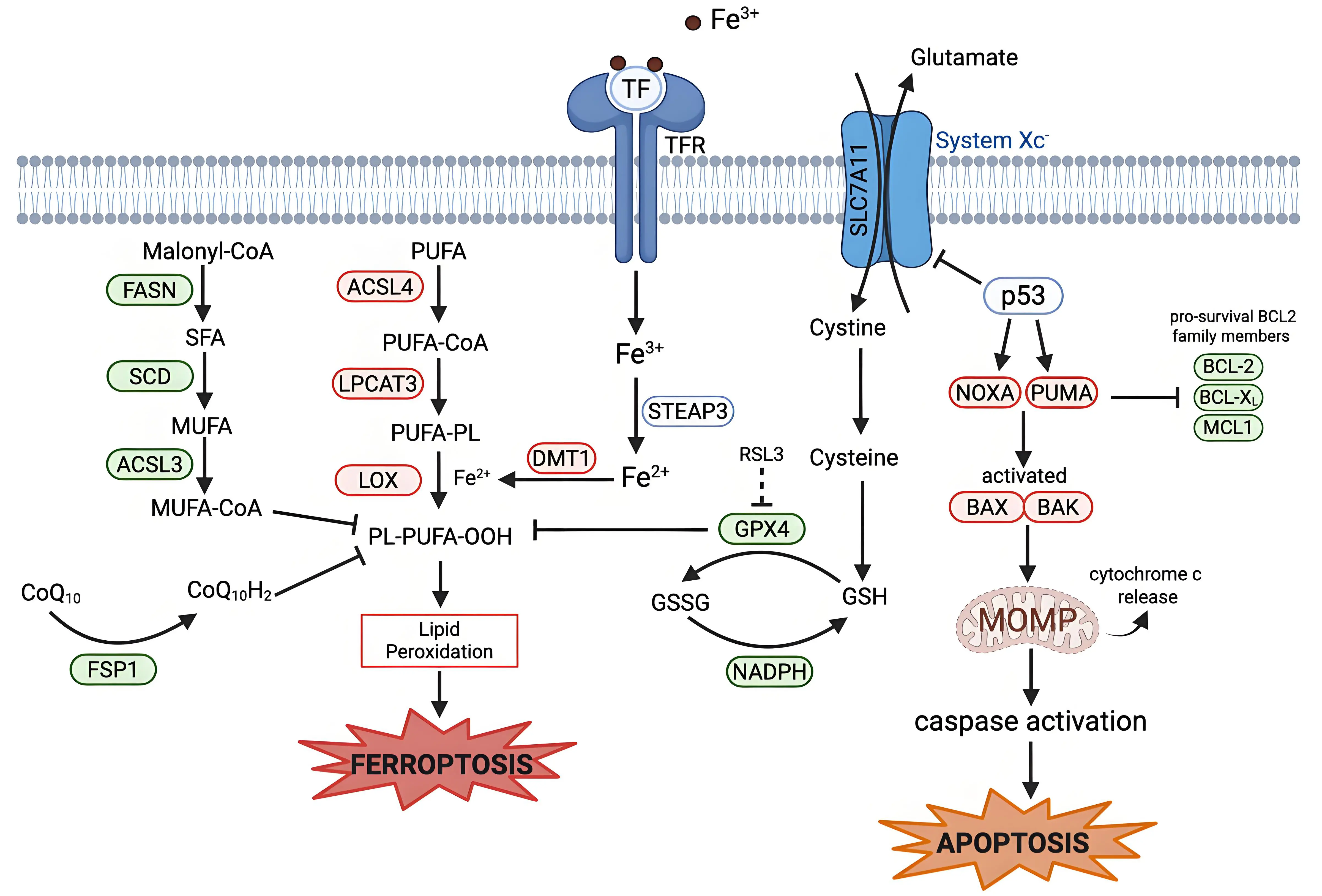 Figure 2. Mechanistic crosstalk between ferroptosis and apoptosis. Apoptosis is regulated by BCL-2 family proteins. The tumor suppressor p53 can transcriptionally upregulate pro-apoptotic BH3-only proteins (PUMA and NOXA). PUMA and NOXA inhibit anti-apoptotic BCL-2 family proteins (BCL-2, BCL-XL, and MCL1), activating BAX and BAK. BAX/BAK oligomerize to induce MOMP, which leads to release of cytochrome c and eventual caspase-9 activation and apoptotic cell death. P53 links ferroptosis and apoptosis via the suppression of SLC7A11 and induction of PUMA and NOXA. Some BCL-2 family proteins can influence both apoptosis and ferroptosis. Created in BioRender.com. Red: anti-cell death factors; Green: pro-cell death factors; Gray: context-dependent regulator of cell death; SLC7A11: solute carrier family 7 member 11; STEAP3: six-transmembrane epithelial antigen of prostate 3; DMT1: divalent metal transporter 1; FASN: fatty acid synthase; SCD: stearoyl-CoA desaturase; ACSL3: acyl-CoA synthetase long-chain family member 3; ACSL4: acyl-CoA synthetase long-chain family member 4; LPCAT3: lysophosphatidylcholine acyltransferase 3; LOX: lipoxygenase; GPX4: glutathione peroxidase 4; FSP1: ferroptosis suppressor protein 1; PUMA: p53-up-regulated modulator of apoptosis; NOXA: phorbol-12-myristate-13-acetate-induced protein; BCL-2: B-cell lymphoma 2; BCL-XL B-cell lymphoma-extra-large; MCL1: myeloid cell leukemia sequence; BAX: Bcl-2-associated X protein; BAK: Bcl-2 homologous antagonist/killer; MOMP: mitochondrial outer membrane permeabilization.