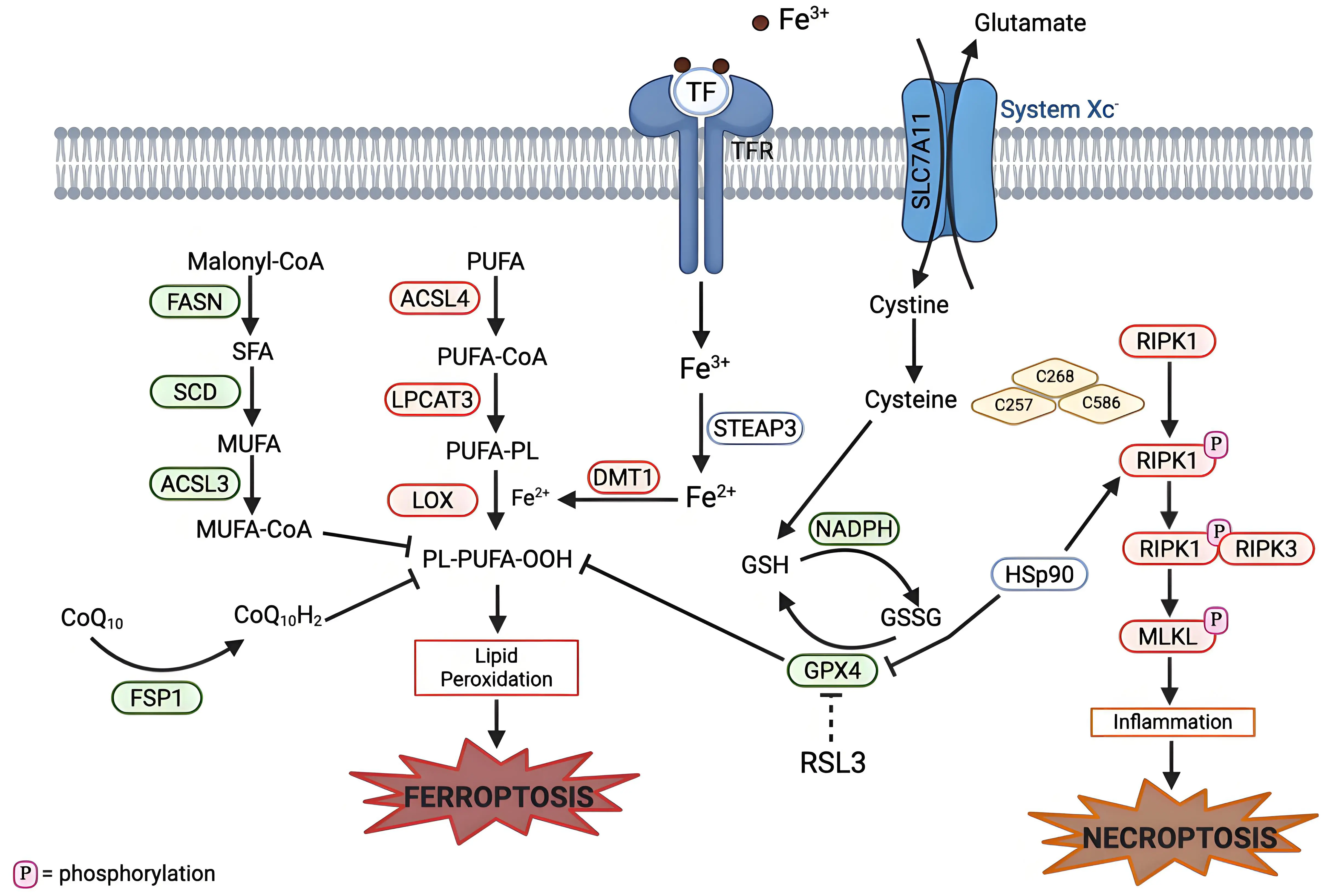 Figure 3. Mechanistic crosstalk between ferroptosis and necroptosis pathways. Necroptosis can be initiated by the activation of RIPK1 (in response to death receptors), which results in phosphorylation of RIPK1. Phosphorylated RIPK1 forms a complex with RIPK3 (the necrosome complex), which then phosphorylates MLKL. This leads to a pro-inflammatory response and eventual necroptotic cell death. HSP90, a molecular chaperone, links ferroptosis and necroptosis by stabilizing RIPK1 to promote necrosome assembly and also degradation of GPX4. Cysteine plays a role in both ferroptosis and apoptosis: Cysteine is involved in GSH production, which is used as a cofactor for GPX4, and also required for autophosphorylation of RIPK1. Created in BioRender.com. Red: anti-cell death factors; Green: pro-cell death factors; Gray: context dependent regulator of cell death; SLC7A11: solute carrier family 7 member 11; STEAP3: six-transmembrane epithelial antigen of prostate 3; DMT1: divalent metal transporter 1; FASN: fatty acid synthase; SCD: stearoyl-CoA desaturase; ACSL3: acyl-CoA synthetase long-chain family member 3; ACSL4: acyl-CoA synthetase long-chain family member 4; LPCAT3: lysophosphatidylcholine acyltransferase 3; LOX: lipoxygenase; GPX4: glutathione peroxidase 4; FSP1: ferroptosis suppressor protein 1; RIPK1: receptor interacting protein kinase 1; RIPK3: receptor interacting protein kinase 3; MLKL: mixed lineage kinase domain-like protein; HSp90: heat shock protein 90.