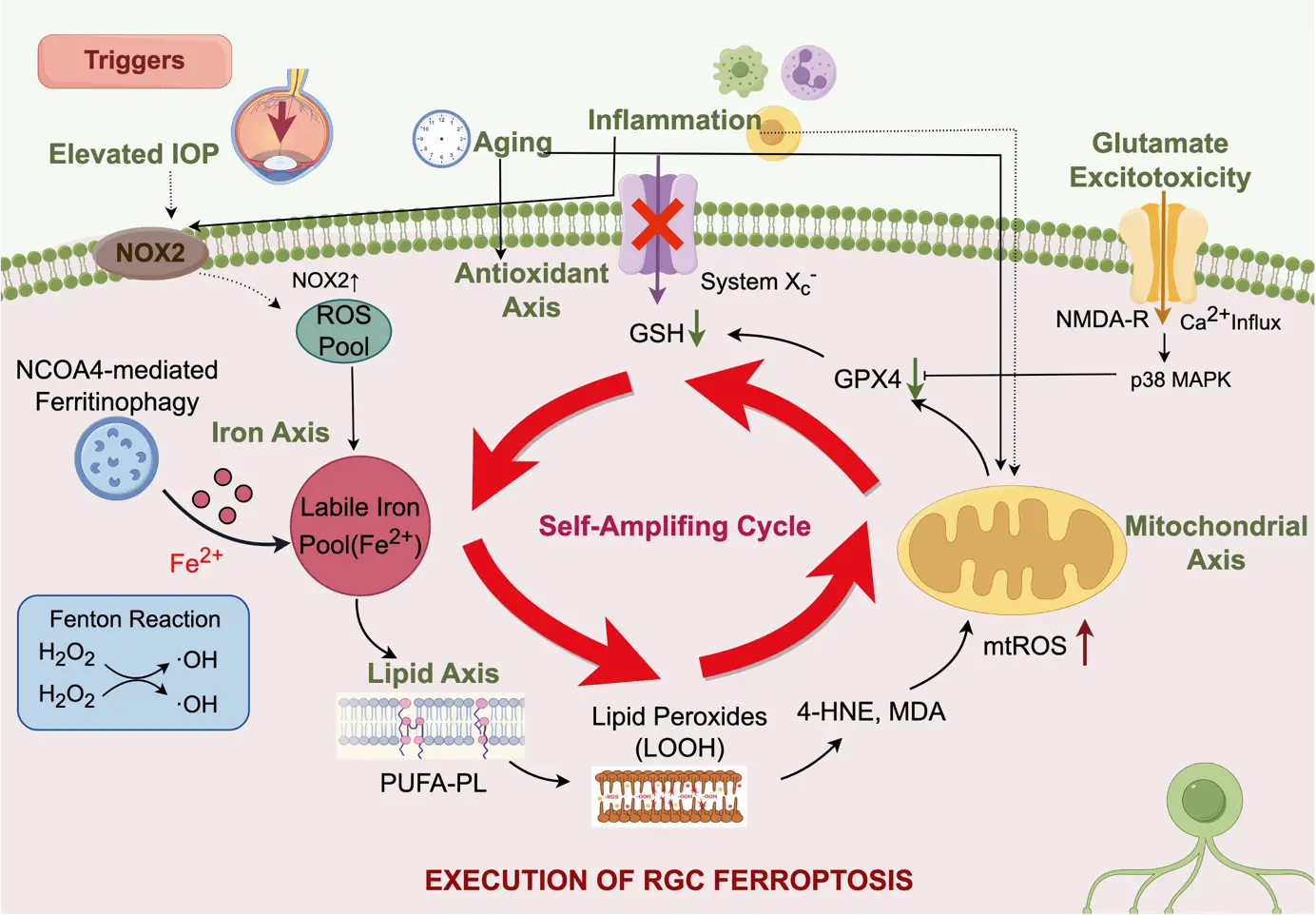 The intersection between oxidative stress and ferroptosis creates a pathological feedback loop: iron accumulation catalyzes Fenton reactions that generate ROS, which intensifies lipid peroxidation and further depletes antioxidant defenses. This reciprocal amplification of oxidative stress and iron-mediated lipid peroxidation creates a self-perpetuating cycle driving RGC death[3,33].
