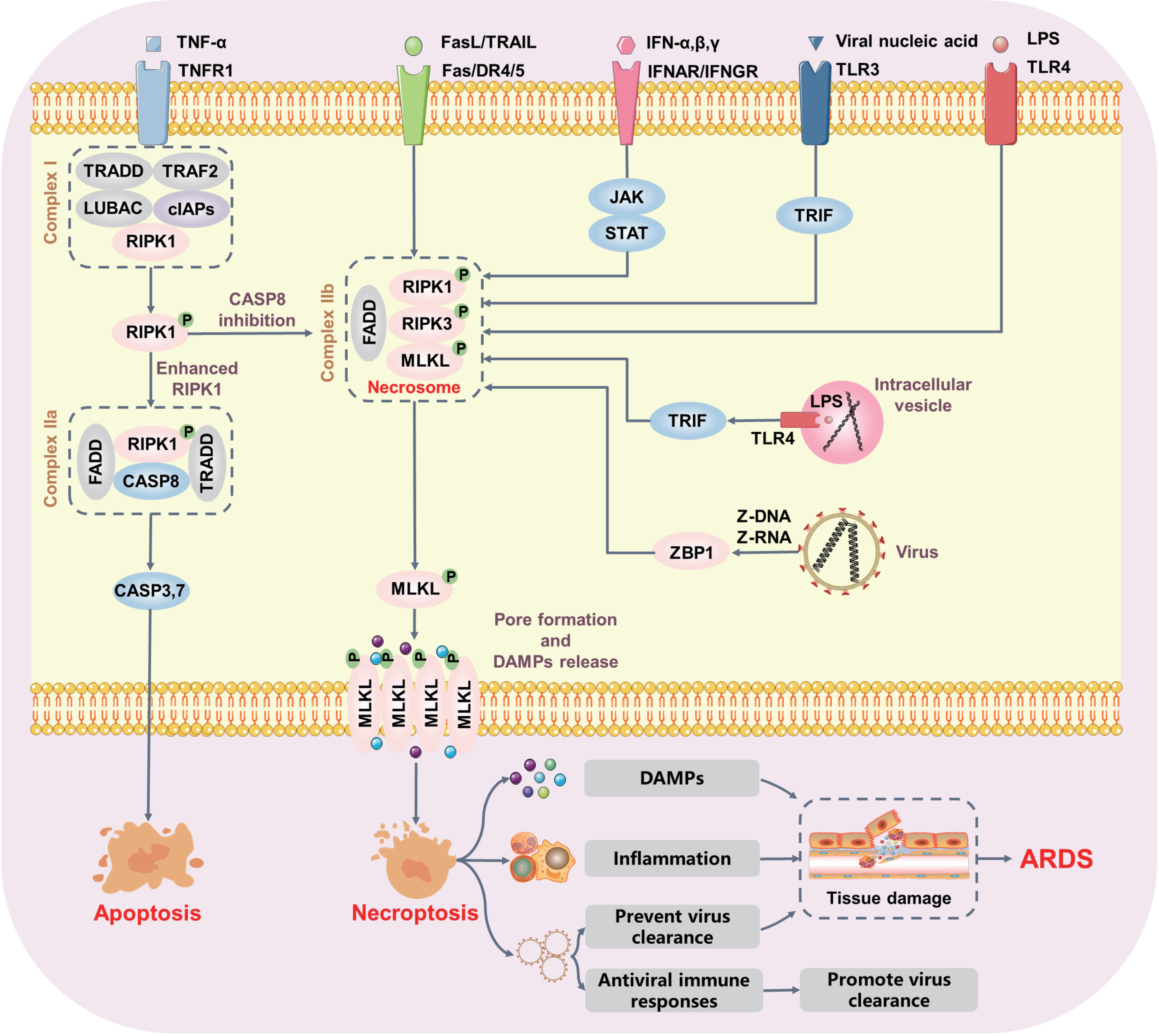 Figure 2. Molecular mechanisms of necroptosis in ARDS. Upon TNF activation, intracellular trimerized TNFR1 mediates the formation of transient complex I, which recruits multiple proteins including TRADD, LUBAC, TAB2, and cIAPs. In complex I, RIPK1 is rapidly polyubiquitylated, leading to the formation of two alternative cytosolic complexes. Complex IIa includes FADD, CASP8, and RIPK1 to promote apoptosis. When CASP8 activation is inhibited, RIPK1 binds to RIPK3 to form complex IIb. Polyubiquitylated RIPK3 in turn increases MLKL phosphorylation, resulting in pore formation and DAMP release. Activated necroptosis triggers excessive inflammation that aggravates lung tissue damage. Notably, activation of TLR3/4 or ZBP1 by pathogen-derived nucleic acids can also promote necroptosis in the absence of caspase function. ARDS: acute respiratory distress syndrome; TNF: tumor necrosis factor; TNFR1: TNF-receptor 1; TRADD: TNFR1-associated via death domain; LUBAC: linear ubiquitin chain assembly complex; TAB2: TGFβ-activated kinase 1-binding proteins 2; cIAPs: cellular inhibitor of apoptosis proteins; RIPK1: receptor-interacting protein kinase 1; FADD: Fas-associated protein with death domain; CASP: caspase; DAMP: damage-associated molecular pattern; TLR: toll-like receptor; ZBP1: Z-DNA binding protein 1.