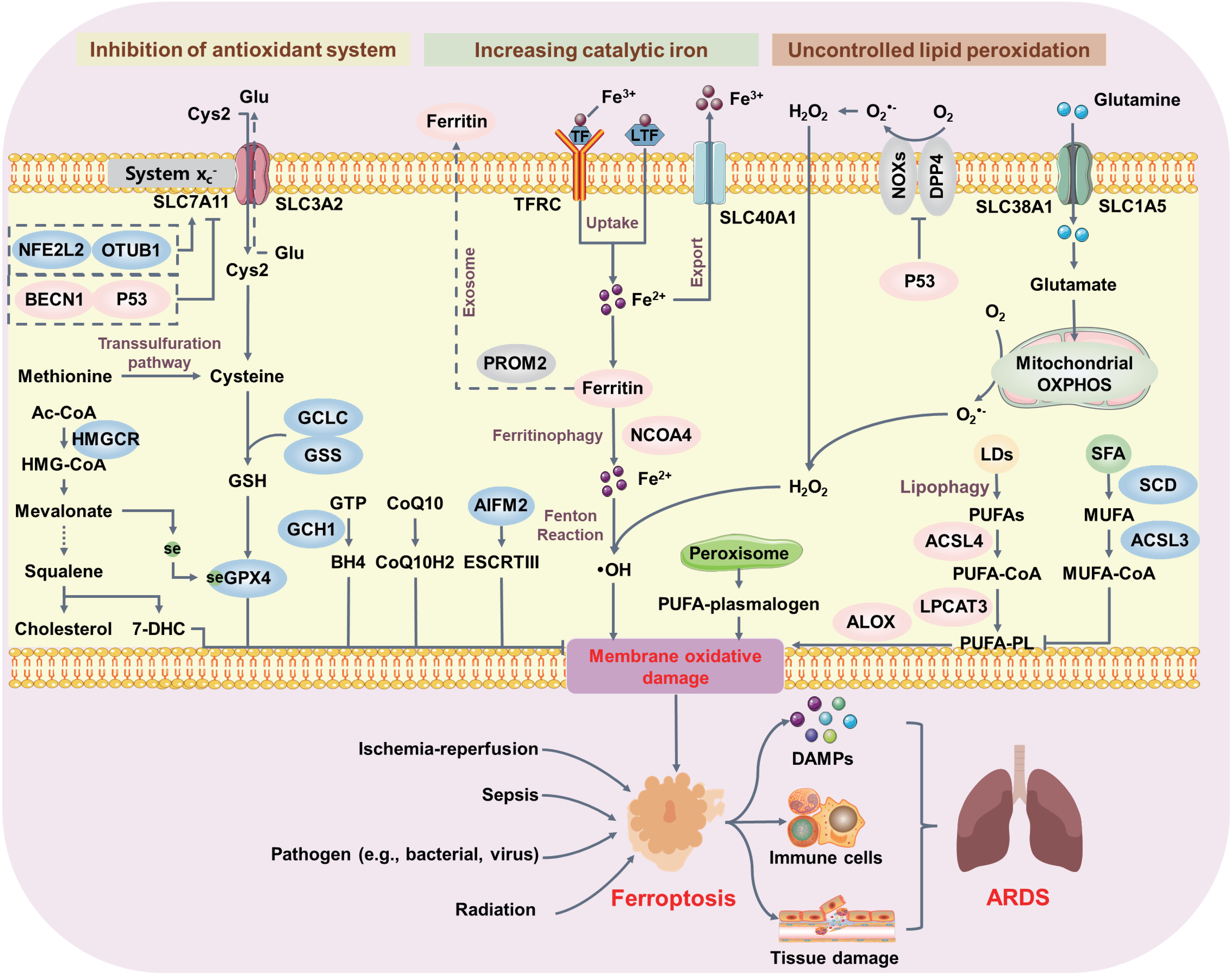 Figure 4. Core molecular mechanisms of ferroptosis in ARDS. Ferroptosis can occur through two major pathways: inhibiting the antioxidant SLC7A11-GSH-GPX4 system and increasing iron accumulation. Inhibition of system xc- decreases GSH production and subsequently suppresses GPX4 activity. Alternatively, CoQ10, BH4, and 7-DHC inhibit ferroptosis independently of GSH. The generation of PUFAs by ACSL4 and LPCAT3 or PUFA-plasmalogens by peroxisomes and subsequent activation of ALOX play pivotal roles in initiating lipid peroxidation. Additionally, NCOA4-mediated ferritinophagy degrades ferritin and increases intracellular catalytic iron, further activating the Fenton reaction to produce hydroxyl radicals involved in membrane oxidative stress. Lipid peroxidation-driven ferroptosis induces excessive tissue damage and uncontrolled inflammation, contributing to ARDS pathological processes. ARDS: acute respiratory distress syndrome; GSH: glutathione; GPX4: glutathione peroxidase 4; 7-DHC: 7-dehydrocholesterol; PUFAs: polyunsaturated fatty acids; ACSL4: acyl-CoA synthetase long-chain family member 4; LPCAT3: lysophosphatidylcholine acyltransferase 3; ALOX: arachidonate lipoxygenase; NCOA4: nuclear receptor coactivator 4.