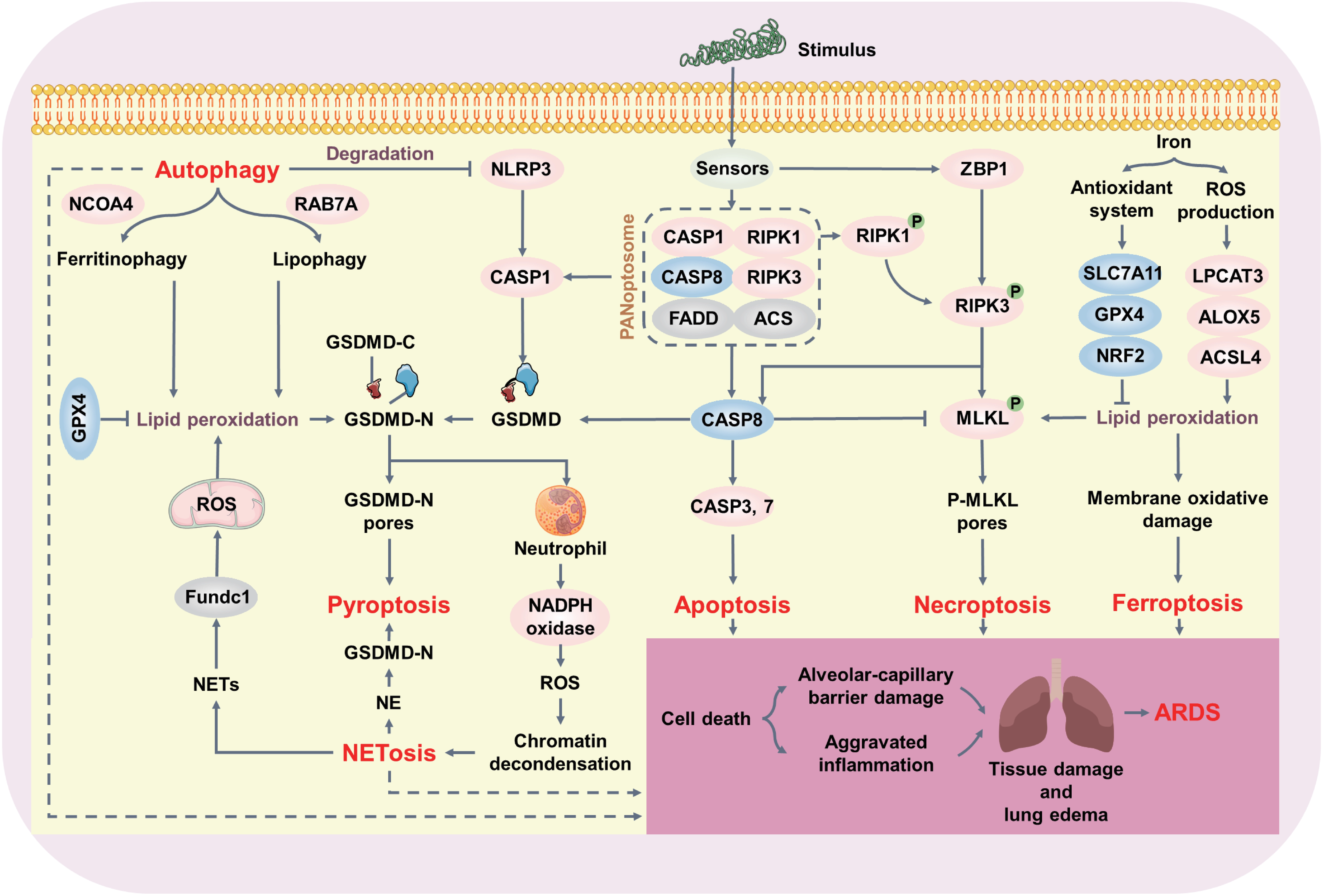 Figure 5. Crosstalk among cell death pathways in ARDS. Diverse initiator and effector molecules involved in various RCD types are interchangeably used to execute cell death. For example, activated CASP8 not only induces apoptosis but also promotes GSDMD cleavage to trigger pyroptotic cell death. Additionally, procaspase-8 assembly with RIPK1 and FADD can activate necroptosis, indicating connectivity between apoptosis and necroptosis. Lipid peroxidation is an emerging mechanism linking various forms of cell death. Excessive lipid peroxidation, the prominent feature of ferroptosis, can activate executioners of pyroptosis (e.g., GSDMD) and necroptosis (e.g., MLKL). Autophagy is also involved in lipid peroxidation through ferritinophagy and lipophagy while promoting NLRP3 degradation, suggesting that autophagy is an important regulatory mechanism for pyroptosis and ferroptosis. NETosis occurs downstream of other RCD patterns and can be triggered by activated GSDMD. Released NE and NETs, in turn, induce necroptosis and ferroptosis, respectively. Ultimately, these cell death patterns coordinate and cooperate to promote ARDS development. ARDS: acute respiratory distress syndrome; RCD: regulated cell death; CASP: caspase; GSDMD: gasdermin D; RIPK1: receptor-interacting protein kinase 1; FADD: Fas-associated protein with death domain; MLKL: mixed lineage kinase domain-like; NLRP3: NOD-like receptor family, pyrin domain-containing protein 3; NE: neutrophil elastase; NETs: neutrophil extracellular traps.