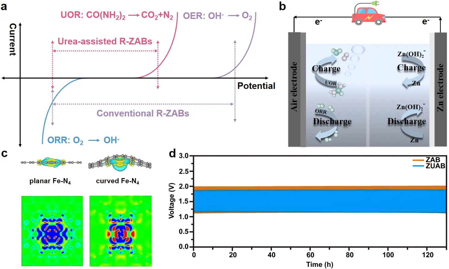 By comparing SEM and TEM images, the morphology of Fe SA/NC differs significantly from that of Fe SA/NhcC, revealing the presence of curved surfaces (Figure 2a,b,c,d). This is supported by extended X-ray absorption fine structure (EXAFS) data. The average Fe-N bond length in Fe SA/NhcC was slightly shorter than that of Fe SA/NC (i.e., 1.92 vs. 2.01 Å, Figure 2e), indicating the formation of a local strain effect induced by the curved carbon nanostructure. Such high surface curvature of the carbon support facilitates fine-tuning of the spatial charge redistribution at Fe-N4 sites (Figure 2f). Moreover, the curved Fe-N4 site with moderate curvature was proven to show superior intrinsic ORR/UOR activity relative to the zero-strain planar Fe-N4 site. The resultant urea-assisted R-ZAB prepared with Fe SA/NhcC exhibited an ultra-low charge-discharge voltage difference of 0.686 V, significantly lower than that of conventional R-ZABs. It also exhibits long-term cycling stability for 130 h at 20 mA cm-2.