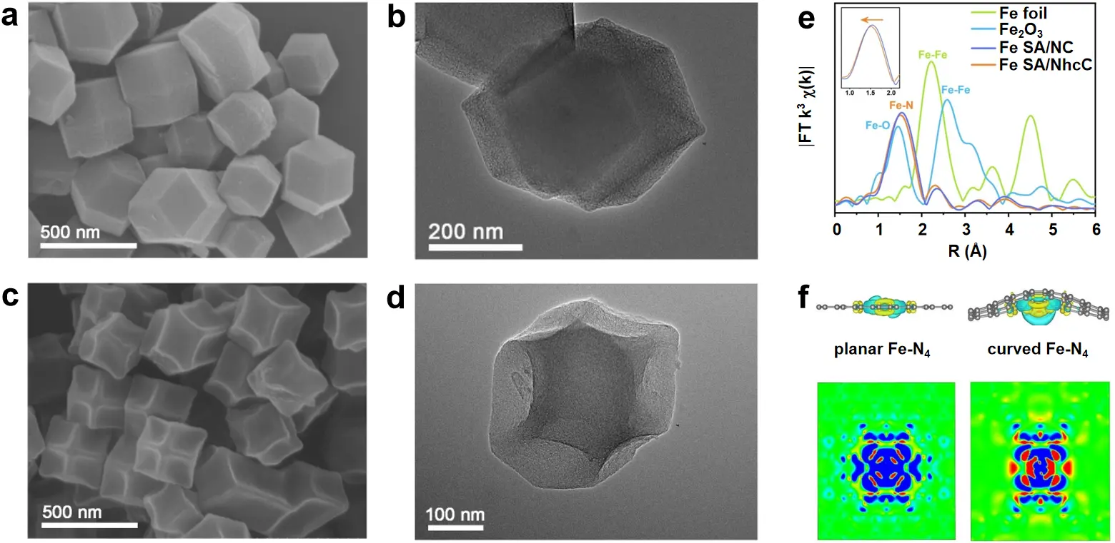 Figure 2. (a-d) SEM and TEM images of (a, b) Fe SA/NC and (c, d) Fe SA/NhcC; (e) FT spectra as obtained from the k3-weighted Fe K-edge EXAFS data recorded for Fe SA/NC, Fe SA/NhcC, Fe foil and Fe2O3; (f) Charge density difference (up) and 2D contour plot (down) for planar and curved Fe-N-C. Republished with permission from[20]. SEM: scanning electron microscopy; TEM: transmission electron microscopy; SA: single atom; NhcC: highly curved N-doped carbon dodecahedron with concave morphology; FT: fourier Transform; EXAFS: extended X-ray Absorption fine structure.