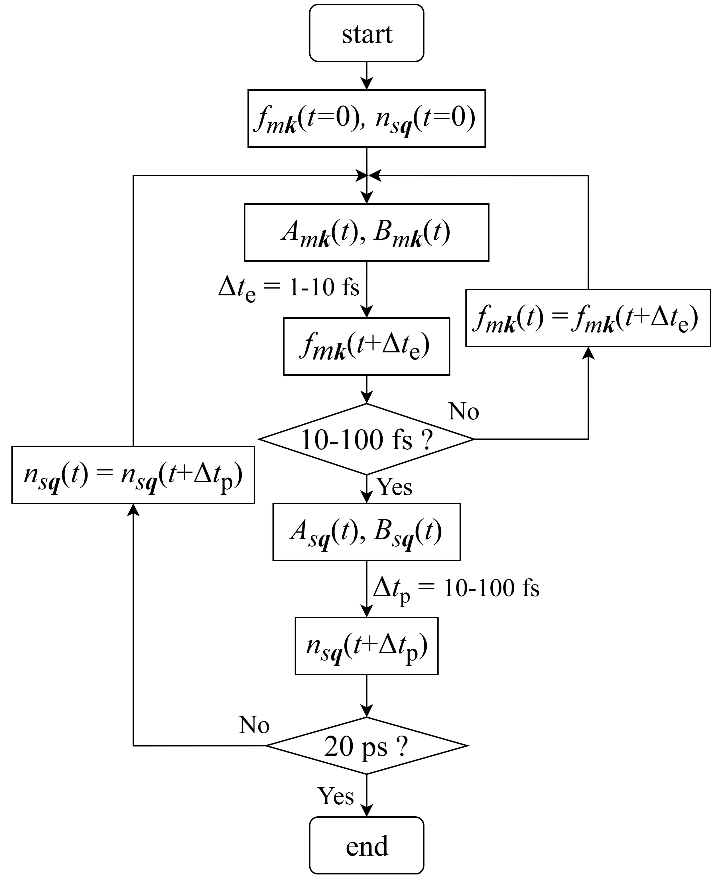 As shown in Figure 1, a high-temperature FD distribution for electrons and a low-temperature BE distribution for phonons are used as the initial distributions to calculate the Amk and Bmk, which are implemented by the EPW package[35]. Next, we solve for the electron distribution function using the Euler method. Considering that the relaxation time of ph-ph scattering is several orders of magnitude longer than that of e-ph scattering, we first iterate the electron distribution function for 10-100 fs before starting the iteration of the phonon distribution. The calculation of the Asq and Bsq employs both the EPW and ShengBTE packages[36].