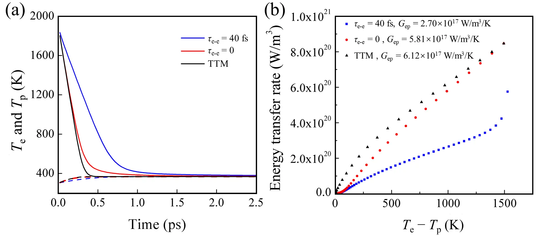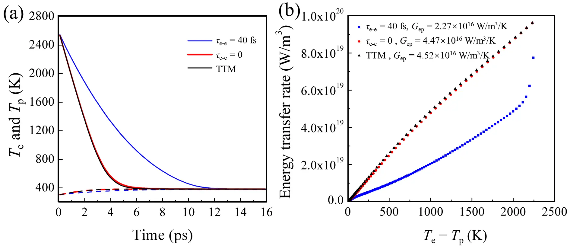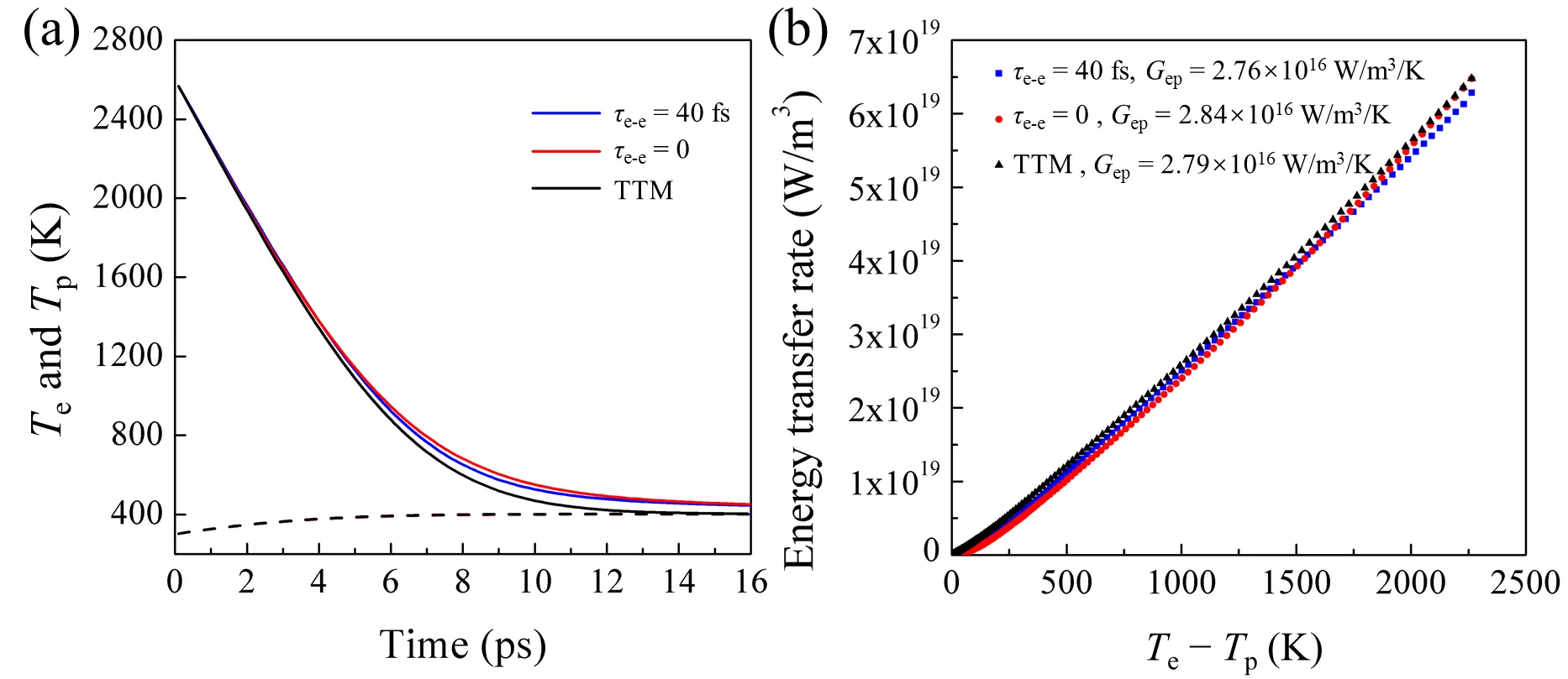 In Figure 2b, we plot the energy transfer rate from electrons to phonons as a function of the temperature difference between the two subsystems. The slope corresponds to Gep as defined in the TTM. The fitted Gep is 2.76 × 1016, 2.84 × 1016, and 2.79 × 1016 W/m3/K for τe-e = 40 fs, τe-e = 0, and TTM, respectively. These results are slightly larger than reported values (~2.2 × 1016 W/m3/K)[46-48]. To examine this discrepancy, we compute the electronic heat capacity as a function of Te during relaxation (Figure S6). The fitted electron specific heat constant (76.3 J/m3/K2) also slightly exceeds experimental measurements (67.6 J/m3/K2)[49-51], indicating an overestimation of the electronic eigenvalues. Nevertheless, all deviations remain below 15%, supporting the accuracy of our calculations.