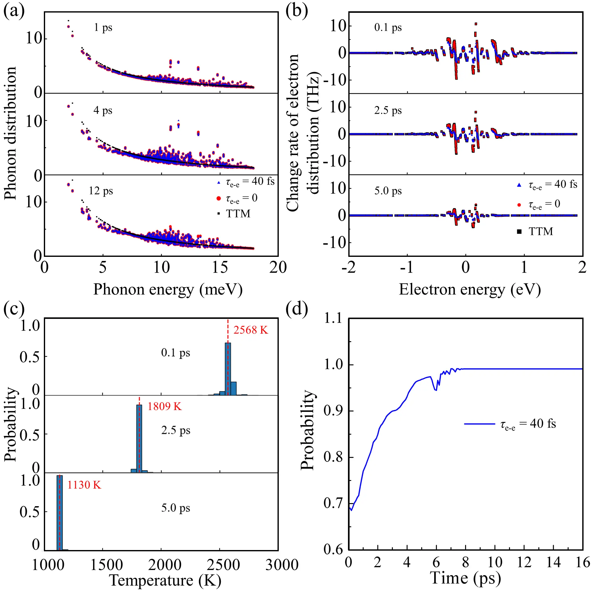 The difference between τe-e = 0 and TTM is relatively small, even though the phonons are confirmed to remain in a non-equilibrium state within 12 ps (Figure 3a), consistent with previous reports[20,33]. Surprisingly, the results at τe-e = 40 fs also exhibit no significant deviation, which seems to indicate that the impact of non-thermal electrons on the dynamics may be negligible. To address this issue, we compare the rate of change of the electronic occupation and the distribution of Tmk at different times (Figure 3b,c). The rate of change in electron occupations for τe-e = 0 is nearly identical to that in the TTM case and slightly larger than that for τe-e = 40 fs. This indicates that when the electron distribution is constrained to a FD distribution, the influence of the non-thermal phonon distribution on the overall dynamics is minimal. Moreover, after the first Δtp (0.1 ps), the distribution of Tmk already exhibits a noticeable broadening, indicating that electrons starting from a FD distribution quickly evolve into a non-thermal state through e-ph scattering. After 5 ps, the broadening becomes almost invisible, which is fully consistent with the assumptions of the TTM. These behaviors of electrons can be attributed to the weak e-ph coupling, as well as the lack of strong scattering channels. As a result, over 70% of the electrons have Tmk within 25 K of the average temperature (Figure 3d). Considering only electronic states within a ±2 eV window around the chemical potential, this value is already high, and it would increase further if a larger energy range were included. This indicates that the average temperature is representative of the collective behavior of most electrons.