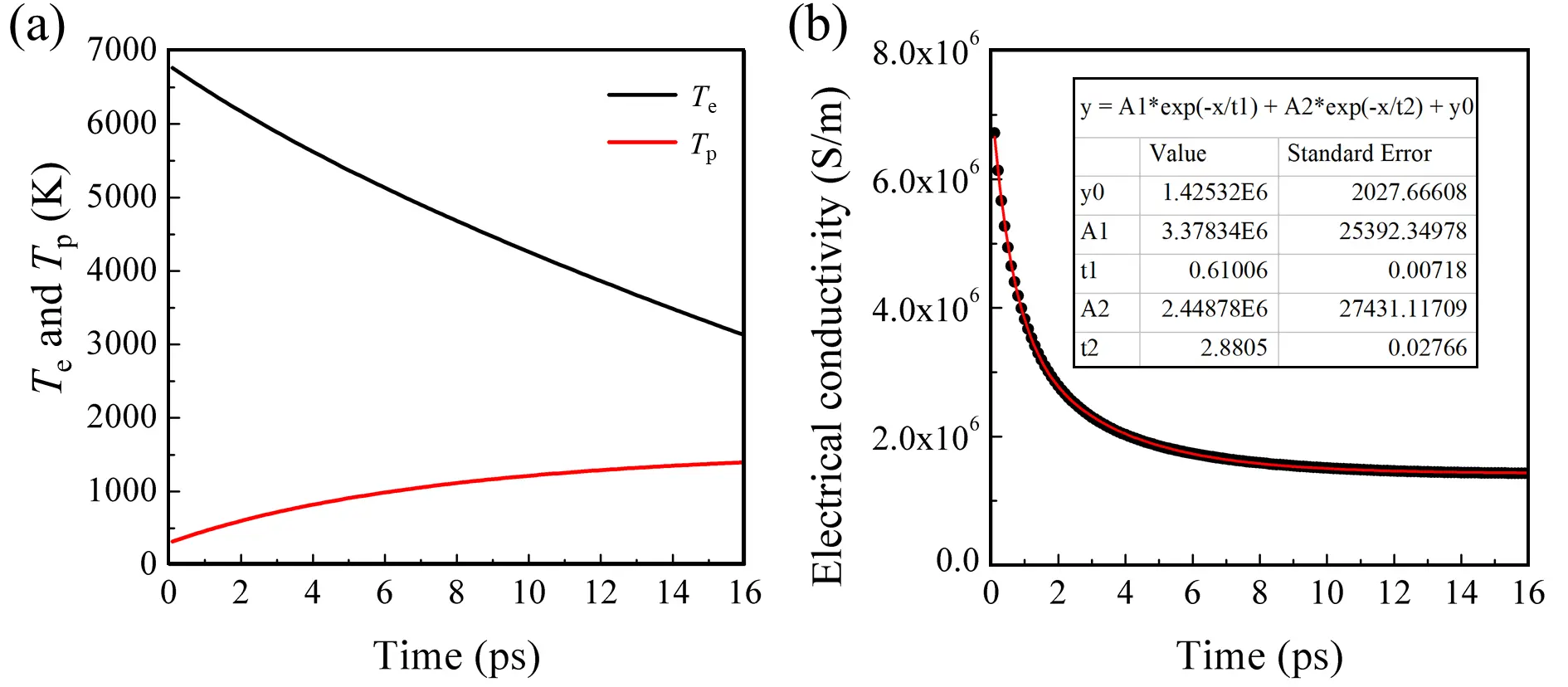 Figure 4. (a) Electron (Te) and phonon (Tp) temperatures and (b) electrical conductivity during relaxation, with initial electron and phonon temperatures of 6,800 K and 300 K, respectively. The table in (b) summarizes the fitting formula, parameters, and their standard errors.