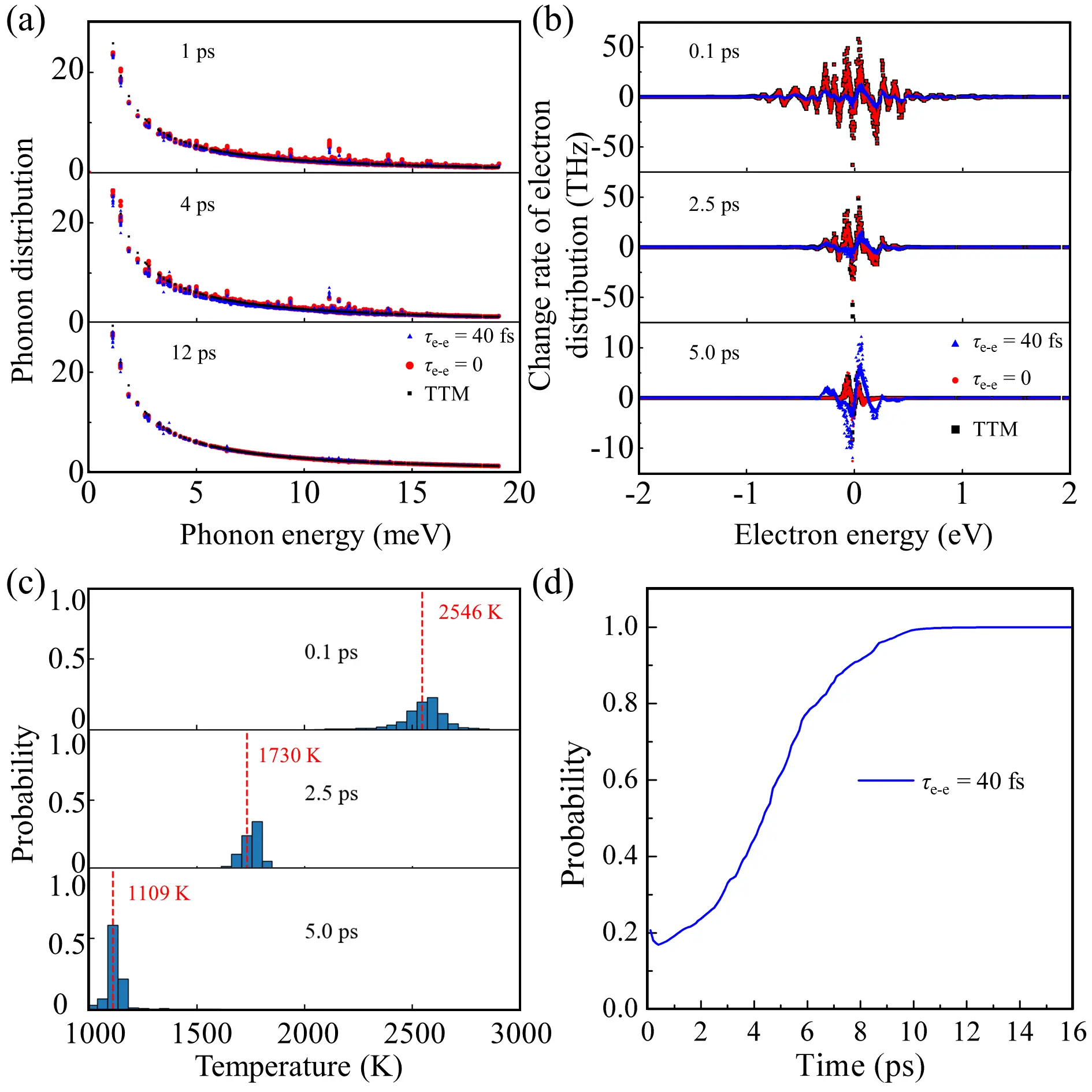 Figure 3. (a) Phonon distribution and (b) rate of change of the electron distribution at different times during relaxation in gold. The chemical potential is set to zero; (c) Effective temperature distribution of electronic states within ± 2 eV around the chemical potential at different times during τe-e = 40 fs relaxation in gold. The vertical axis represents the probability of electronic states falling within each 50 K temperature interval. The red dashed line indicates the current average temperature; (d) Time evolution of the probability that electronic states within ± 2 eV of the chemical potential fall within ± 25 K of the average temperature in gold, under the condition of τe-e = 40 fs.