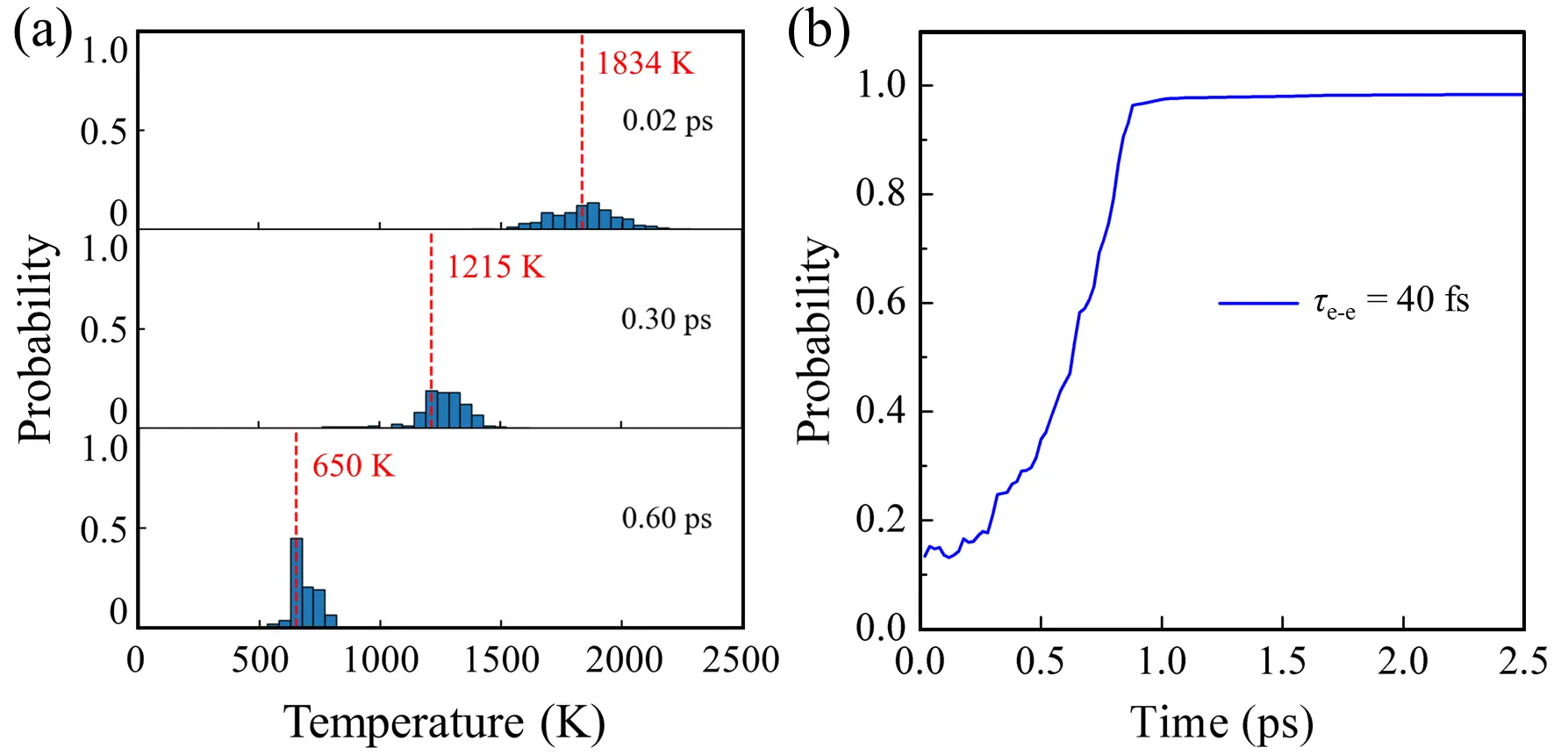 Figure 9. (a) Effective temperature distribution of electronic states within ± 2 eV around the chemical potential at different times during τe-e = 40 fs relaxation in aluminum. The vertical axis represents the probability of electronic states falling within each 50 K temperature interval. The red dashed line indicates the current average temperature; (b) Time evolution of the probability that electronic states within ± 2 eV of the chemical potential fall within ± 25 K of the average temperature in aluminum, under the condition of τe-e = 40 fs.