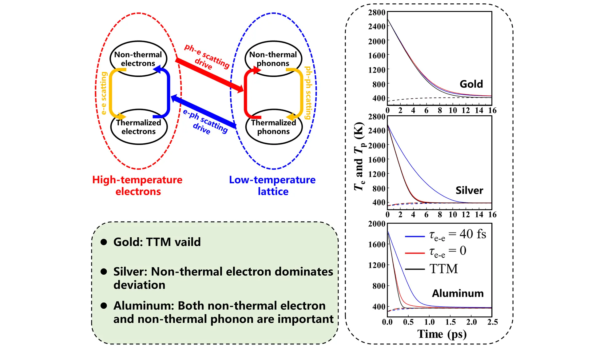 In recent years, the rapid development of pump-probe femtosecond spectroscopy has enabled the observation of intriguing phenomena on sub-picosecond timescales[1-7]. For example, ultrafast electron diffuse scattering provides direct access to the dynamics of the crystalline lattice and electron-phonon (e-ph) interactions with time and momentum resolution[8-14], enabling a detailed understanding of energy transfer between hot electrons and phonons. During ultrafast processes, the system can be described as hot electrons transferring energy to a cold phonon bath via e-ph coupling. The well-known two-temperature model (TTM) provides a simple theoretical framework to describe this relaxation process, assuming that both the electron and phonon subsystems are always thermalized and characterized by distinct Fermi-Dirac (FD) and Bose-Einstein (BE) distributions at different temperatures[15-17]. Within the TTM, the rate of energy transfer from electrons to phonons is governed by the electron-phonon coupling constant (Gep), and an important implication is the connection between Gep and the coupling constant λ used in the Eliashberg generalization of Bardeen-Cooper-Schrieffer (BCS) theory[18]. This relationship allows λ to be extracted from pump-probe measurements, and interestingly, for several metals, the values of λ obtained in this way have shown good agreement with other independent methods, supporting the validity of the TTM[19].
