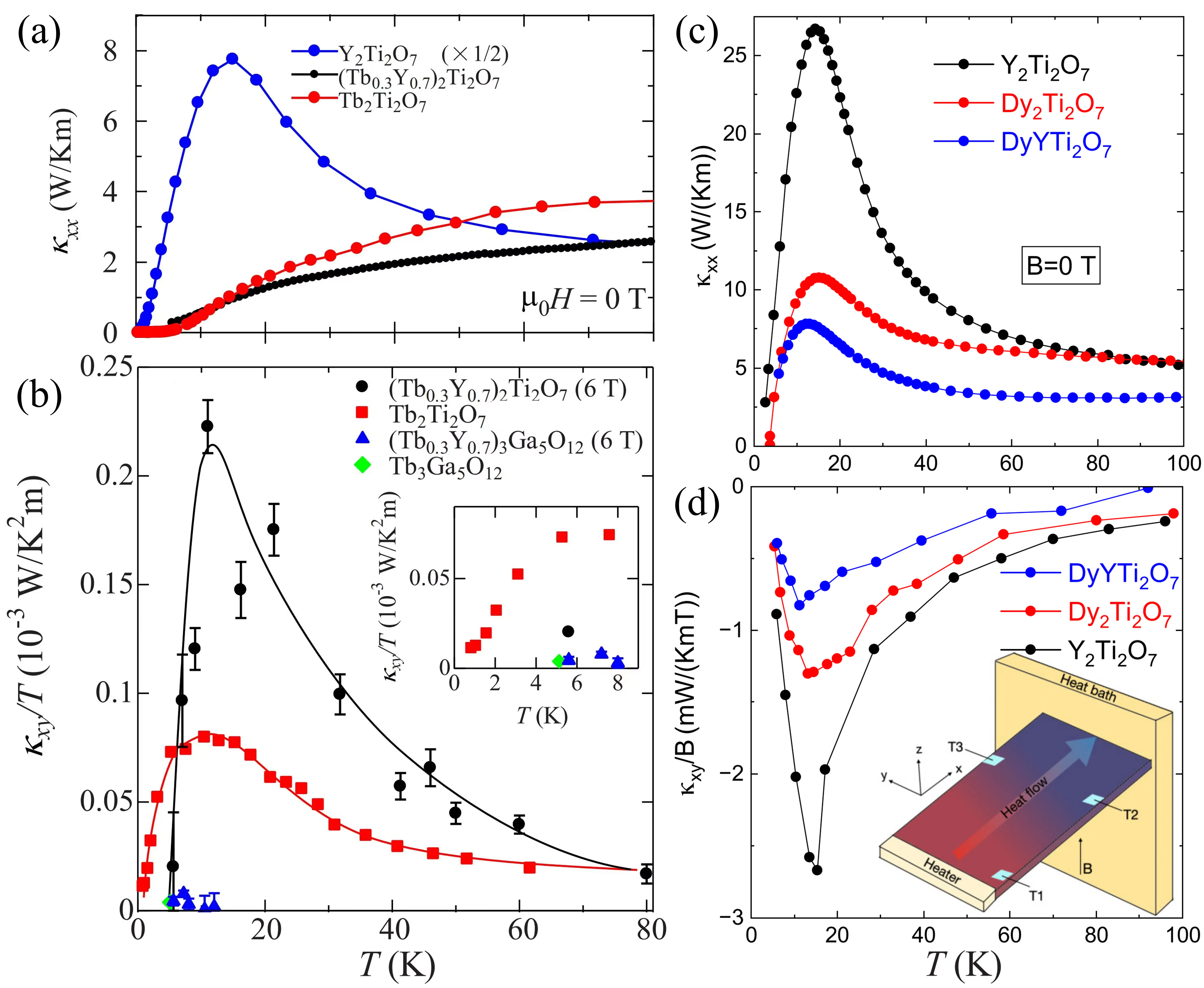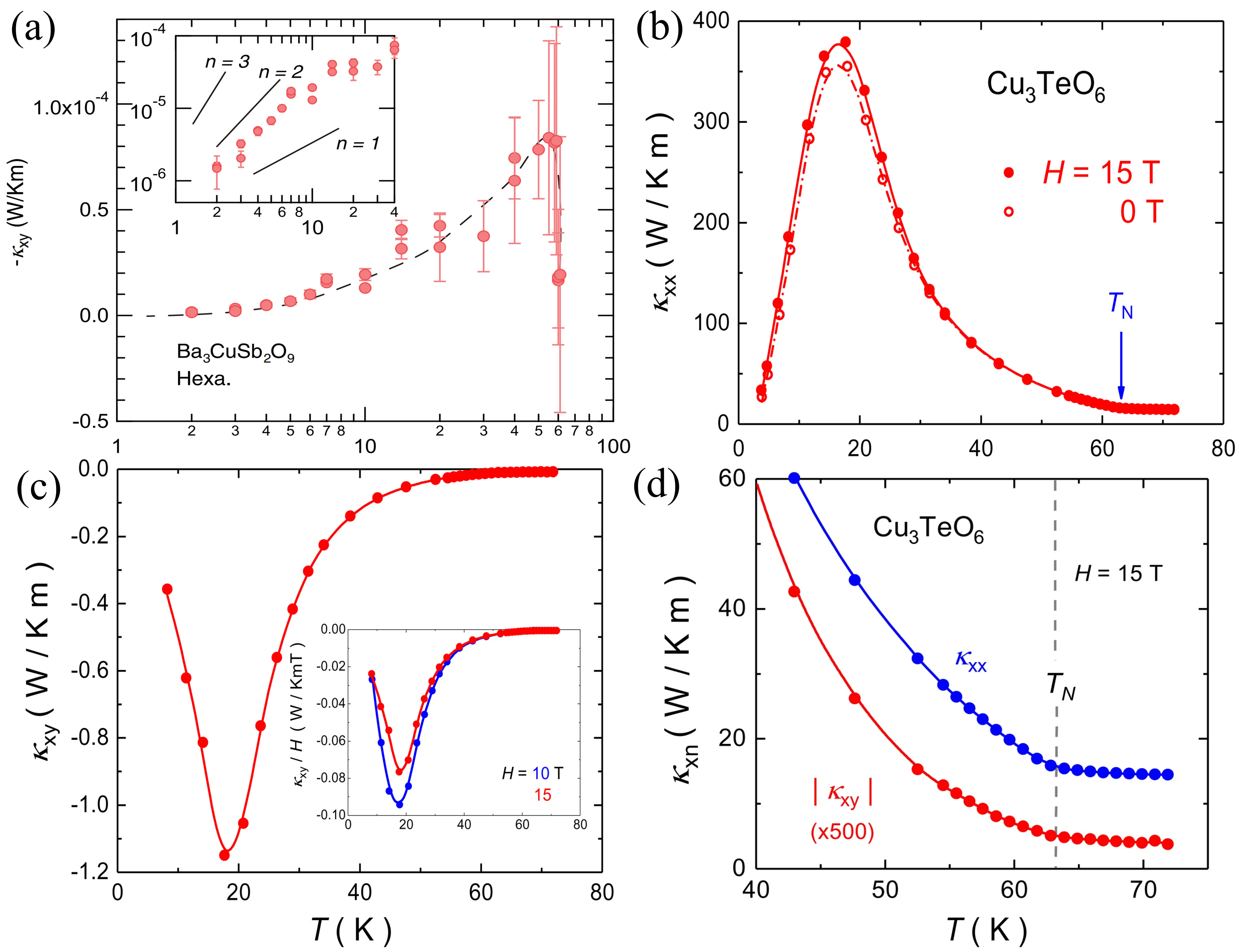 Figure 10. (a) Thermal Hall conductivity κxy as a function of temperature. Republished with permission from[37]; (b) Longitudinal thermal conductivity κxx of Cu3TeO6 at zero field (open circles) and at magnetic field H = 15 T (solid circles); (c) Thermal Hall conductivity κxy of Cu3TeO6 at H = 15 T, inset shows κxy/H at 10 T and 15 T; (d) Comparison of the thermal Hall conductivity κny (both κxx and κxy) of Cu3TeO6. Republished with permission from[121]. The horizontal axes in the figures all represent the absolute temperature T (K).
