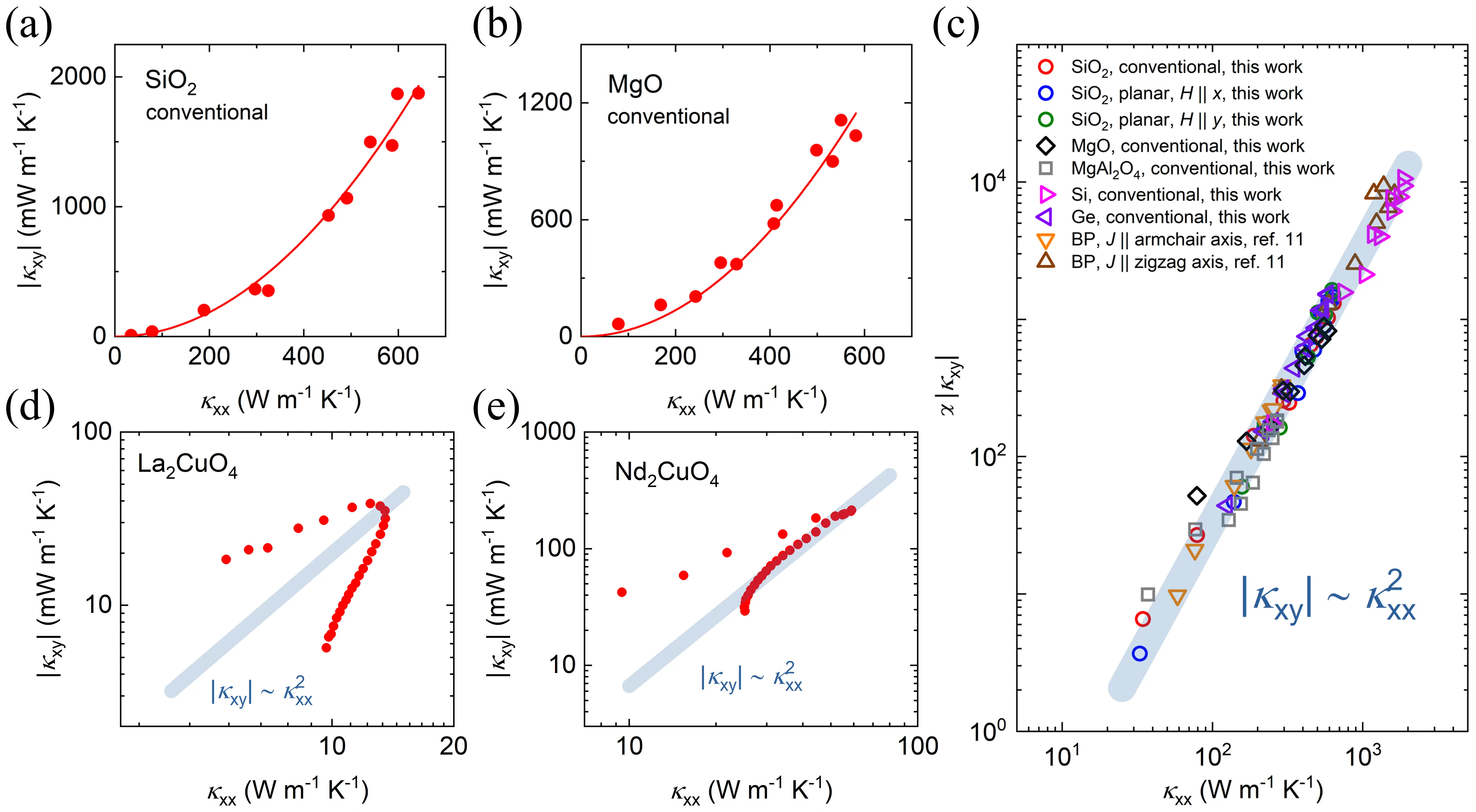 Figure 11. Scaling law of PHE in various materials. (a)SiO2; (b)MgO; (c) The scaling law for non-magnetic insulators and semiconductors; (d)La2CuO4; (e)Nd2CuO4. Republished with permission from[122].