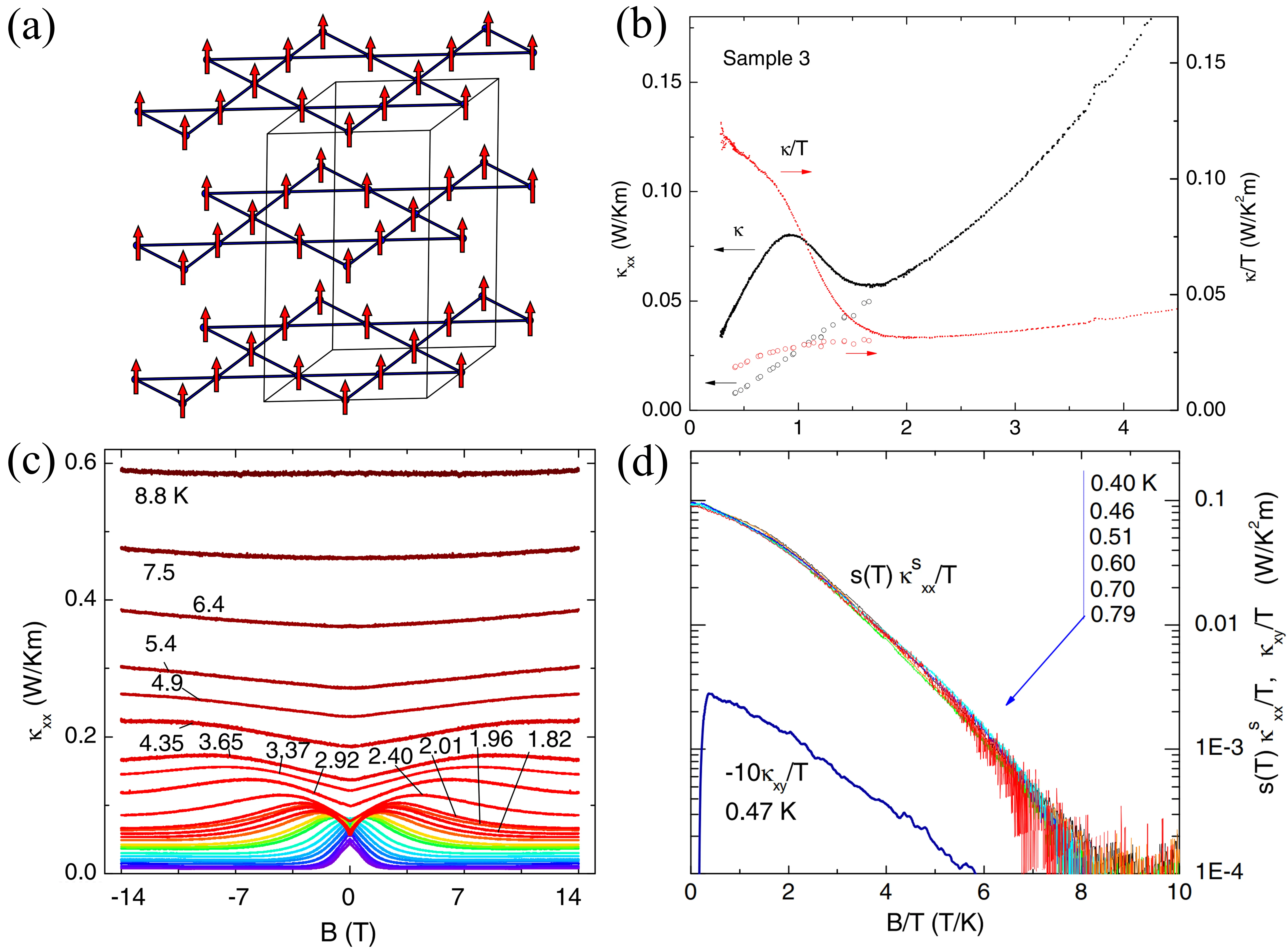 Figure 15. (a) Magnetic structure of Cu(1,3-bdc). Republished with permission from[29]; (b) Temperature dependence of κ (black) and κ/T (red) for T < 4.5 K; (c) Magnetic field B dependence of the longitudinal thermal conductivity κxx at different temperatures; (d) Curves of κxx and κxy after multiplying by a scaling factor s(T). Republished with permission from[30].