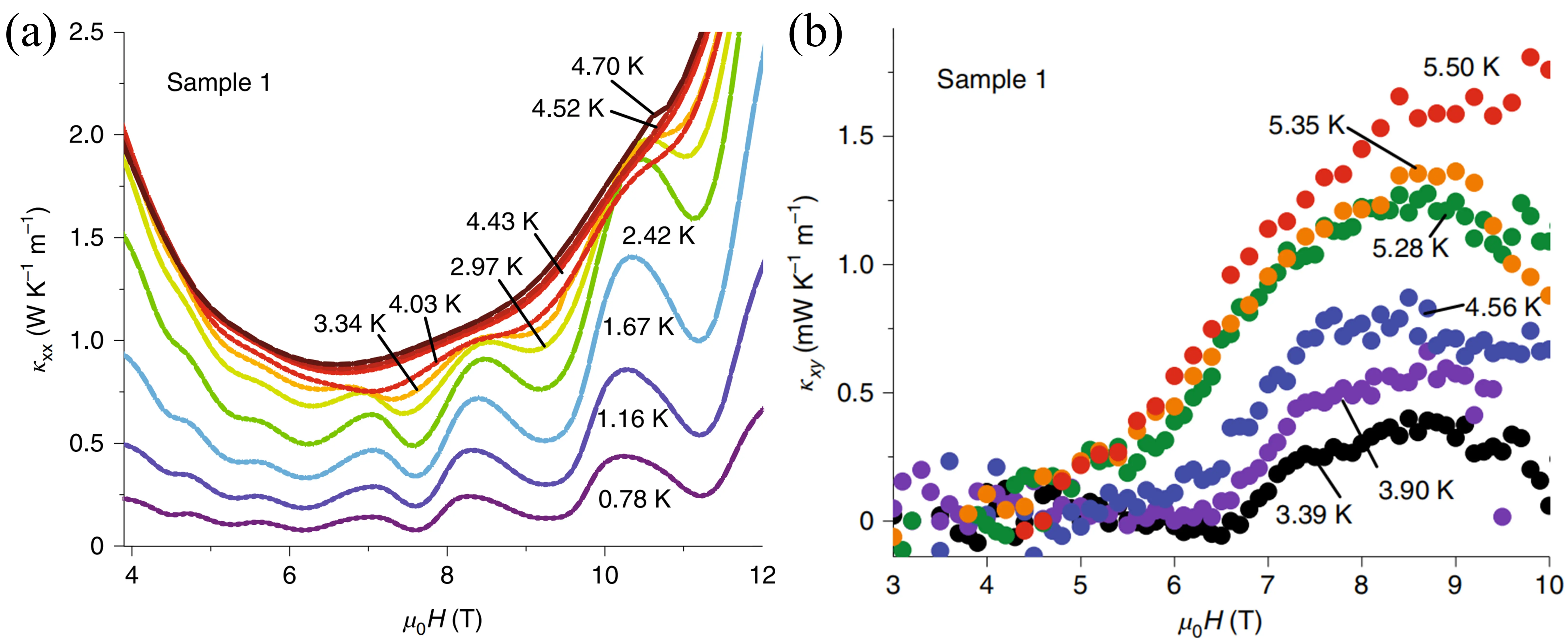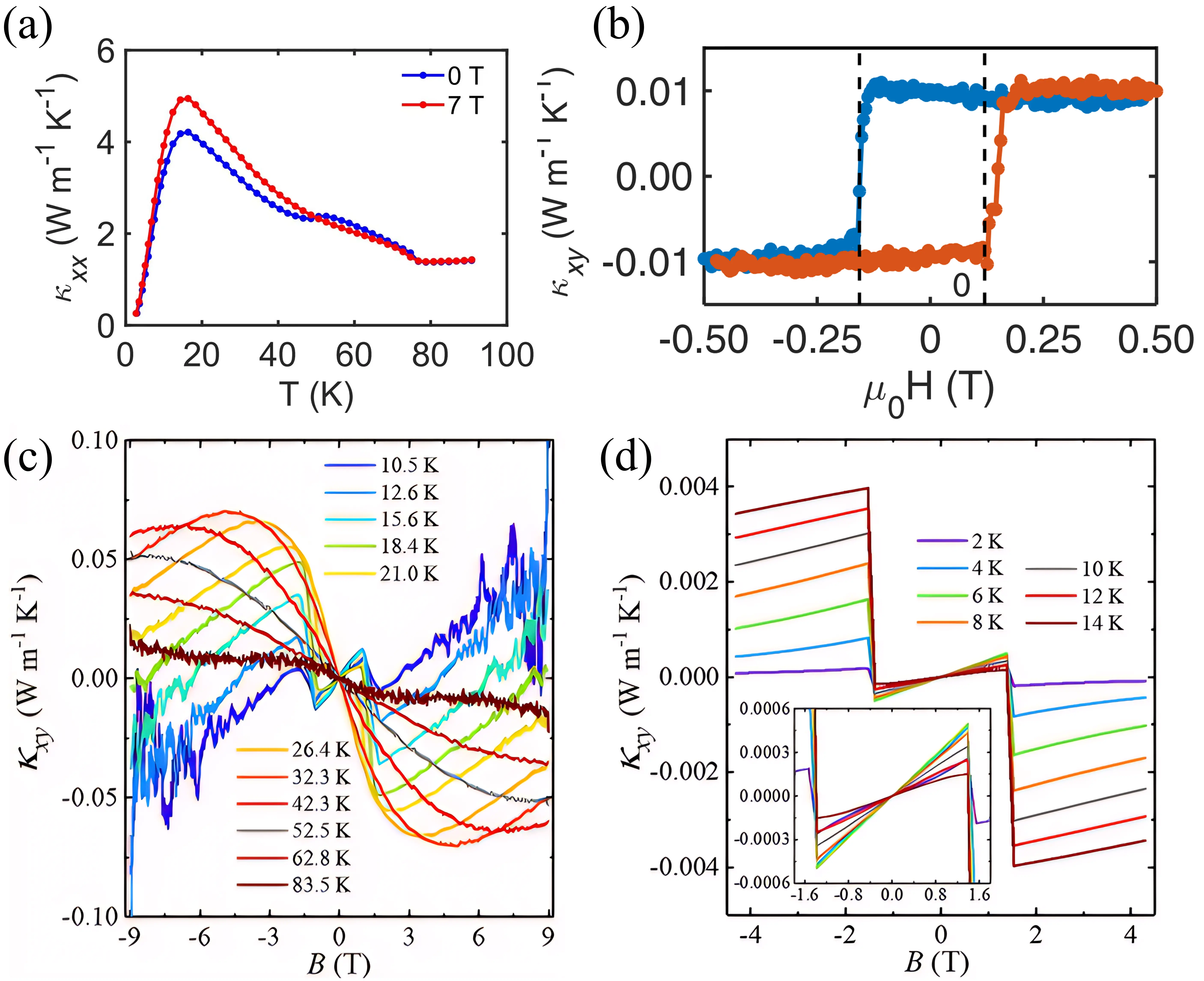 | Material | κxy × 10-3 (W K-1m-1) | κxx (W K-1m-1) | |κxy/κxx| × 10-3 | T (K) | H (T) | Reference |