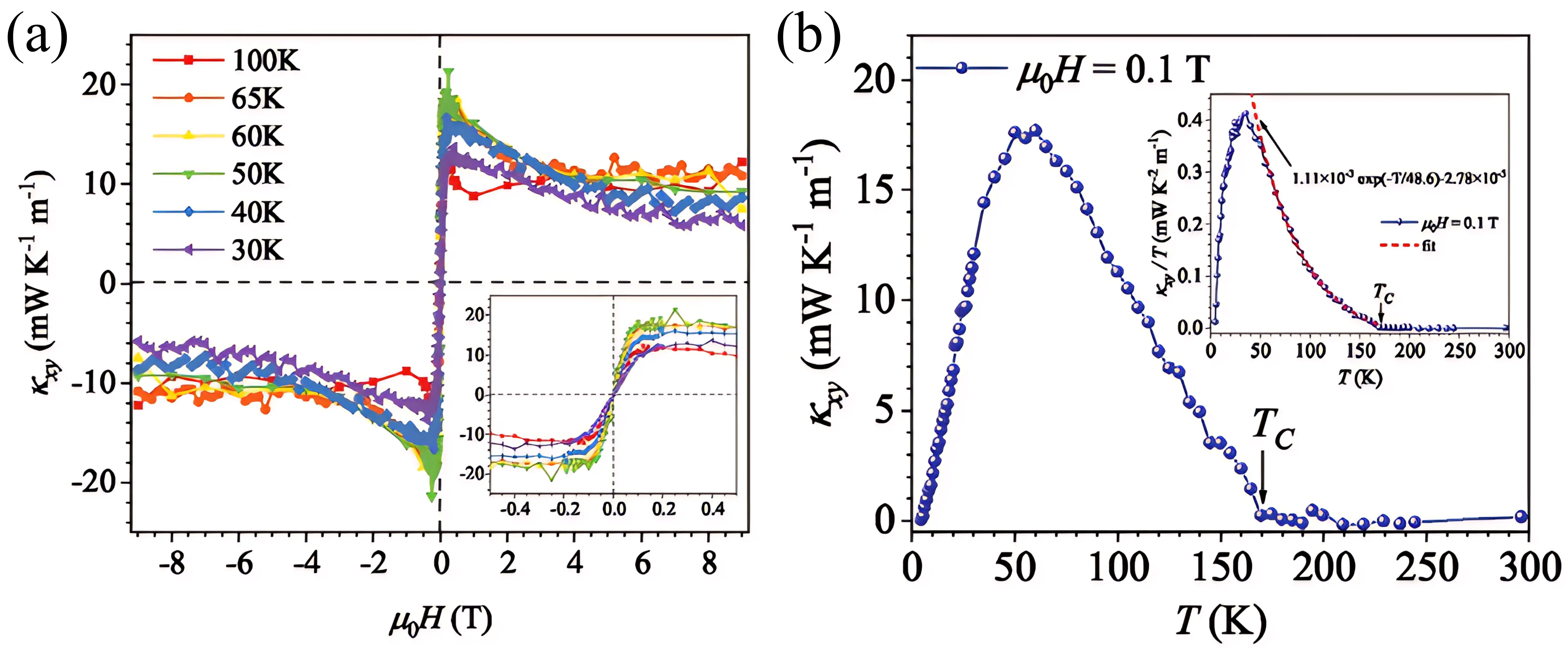 Figure 17. (a) Magnetic field dependence of the thermal Hall conductivity κxy in FeCr2S4 at different temperatures; (b) Temperature dependence of the thermal Hall conductivity κxy in FeCr2S4 under a 0.1 T magnetic field. Republished with permission from[33].