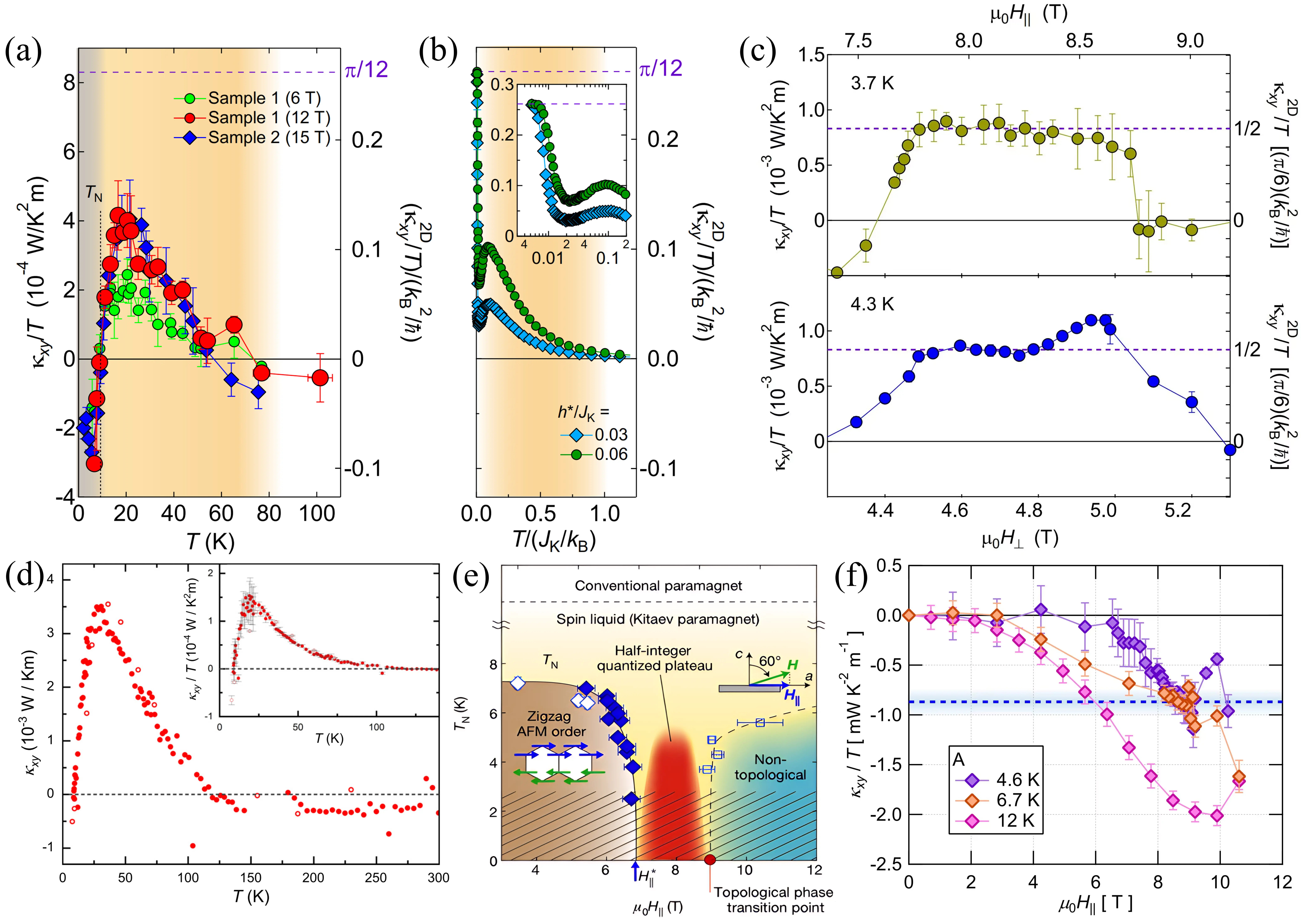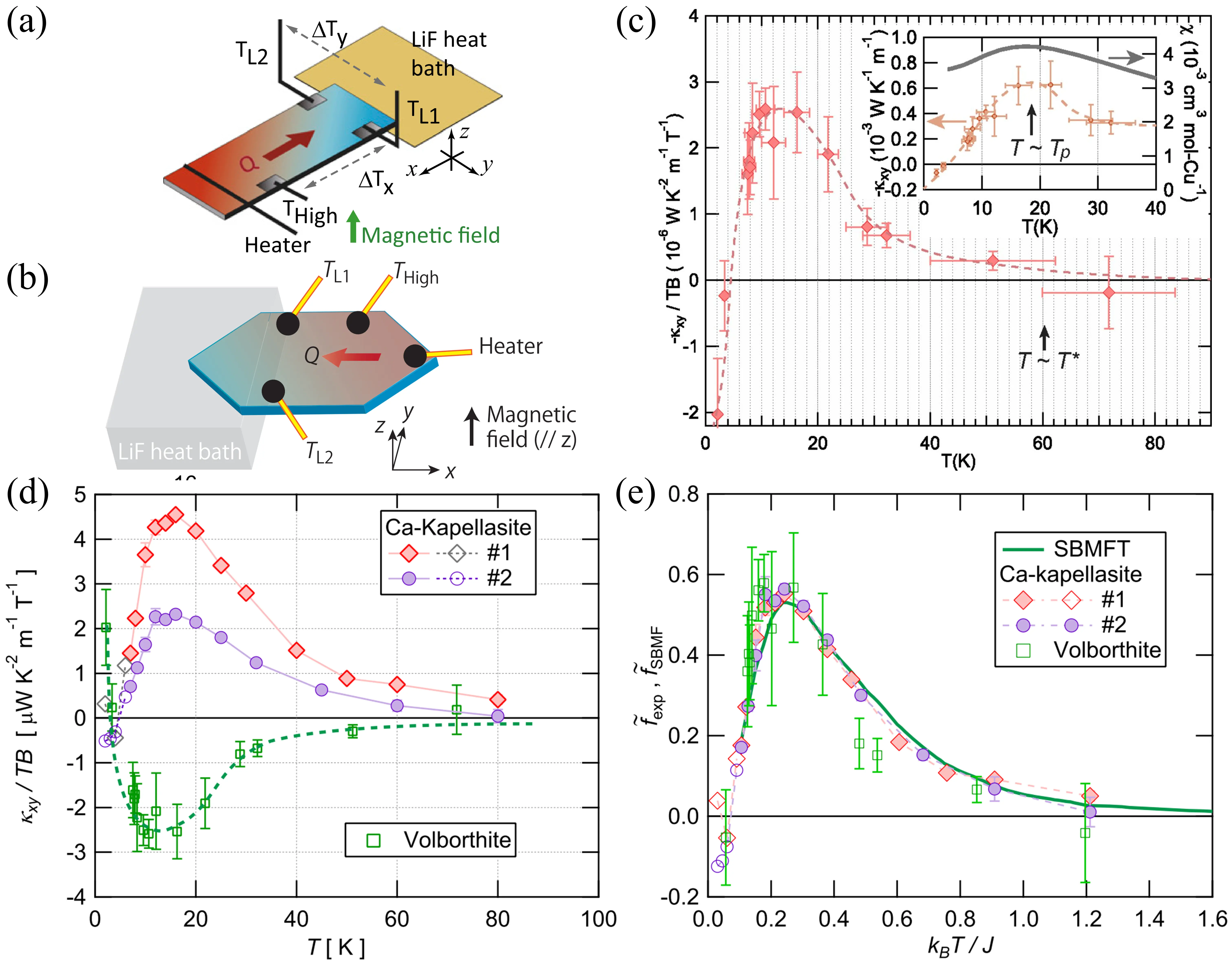 Figure 18. (a) Experimental setup for volborthite; (b) Experimental setup for Ca kapellasite; (c) Temperature dependence of -κxy/TB at H = 15 T in volborthite. Republished with permission from[31]; (d) Temperature dependence of κxy/TB for Ca kapellasite (samples #1 and #2) and volborthite; (e) Variation curves of the dimensionless thermal Hall conductivity fexp(kBT/J) and fSBMF(kBT/J). Republished with permission from[32].